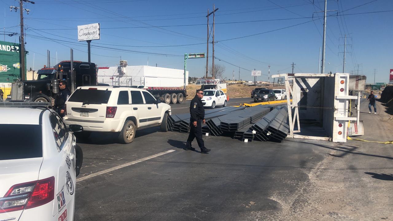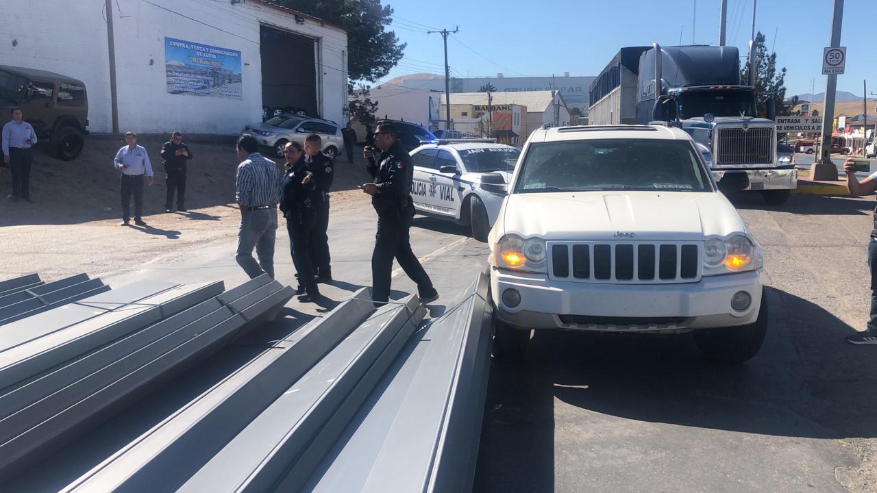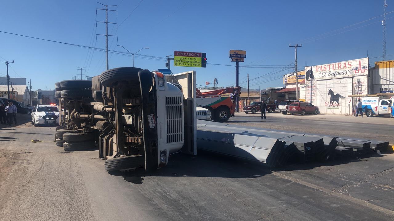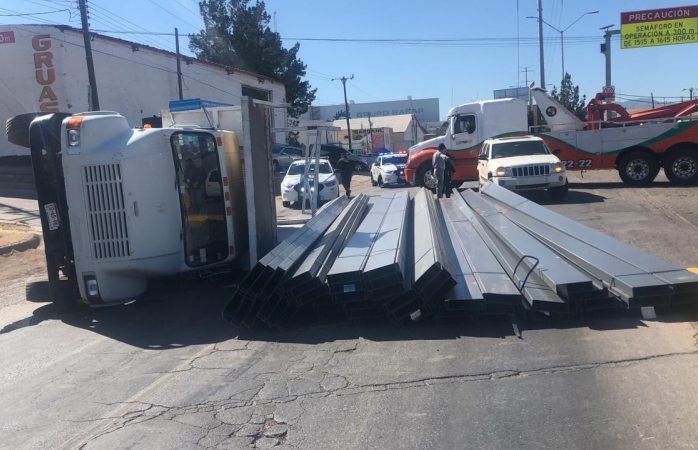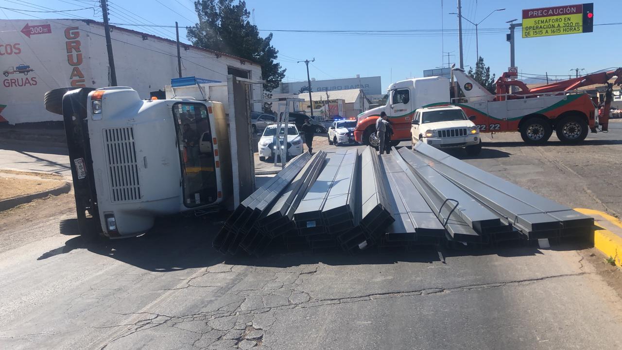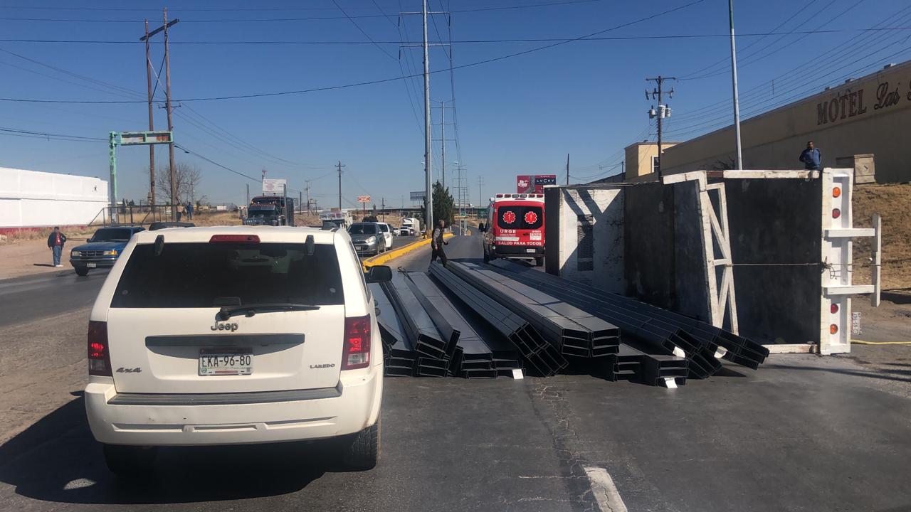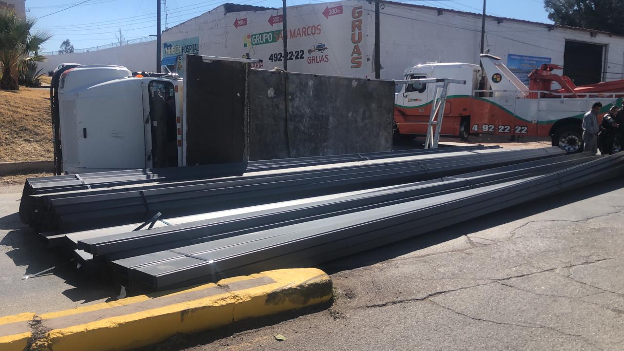 El accidente se presentó cuando el chofer de un camión perdió el control y volcó sobre la avenida Silvestre Terrazas, impactando los polines de acero que transportaba a una camioneta Jeep Laredo.