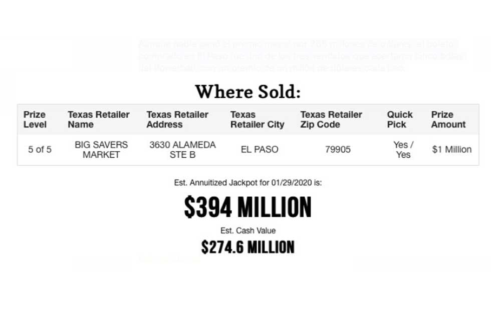 El boleto ganador fue vendido en Big Savers Market, ubicado en 3630 de Alameda, 79905 en el centro de El Paso, cerca del zoológico y cementerio Concordia.