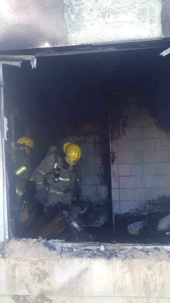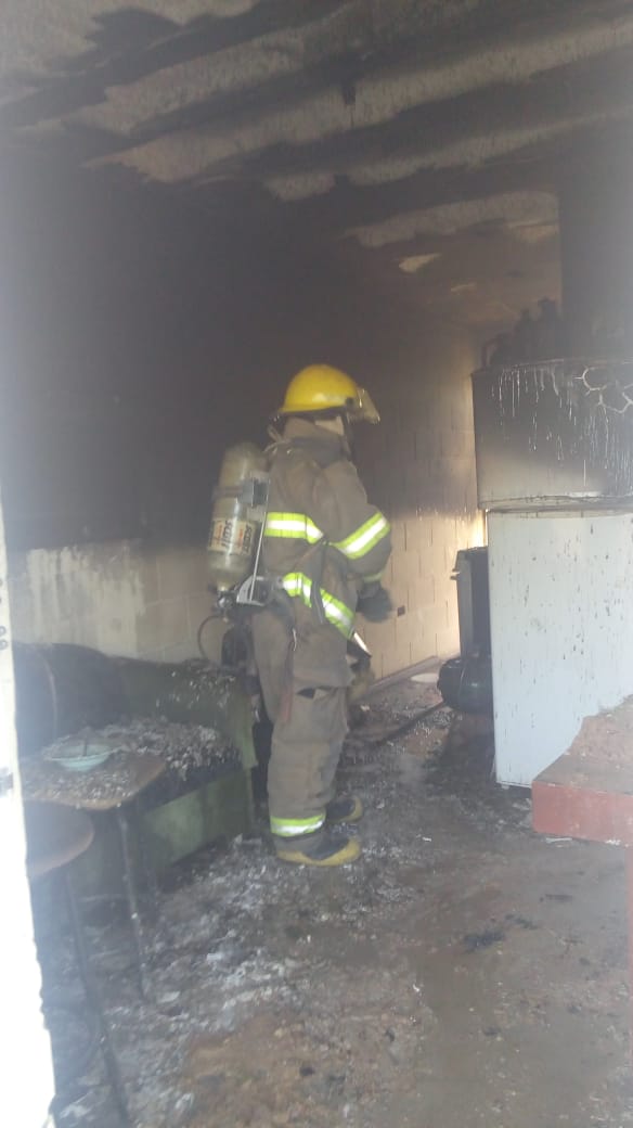 El personal de bomberos sofocaron el incendio en un cuarto de 3 por 3 metros utilizado como recámara, cuyo fuego se propagó al resto del domicilio construido de block y techo de concreto.