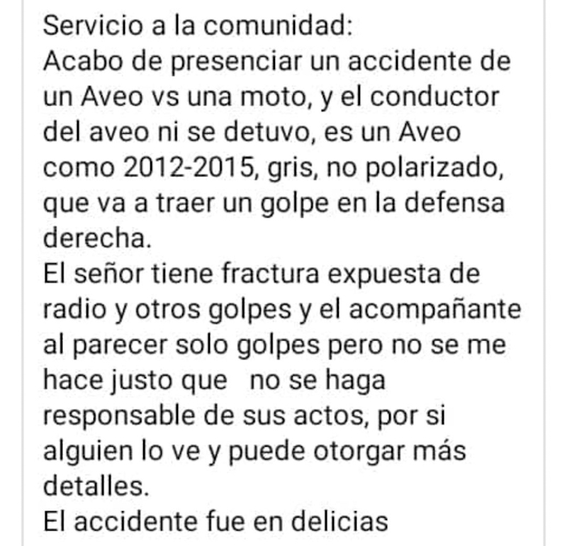 Servicio a la comunidad: Acabo de presenciar un accidente de un Aveo vs una moto, y el conductor del Aveo ni se detuvo, es un automóvil de la marca Chevrolet, línea Aveo como 2012-2015, gris, no polarizado, que va a traer un golpe en la defensa derecha.