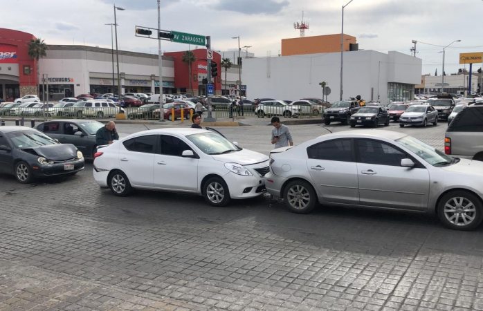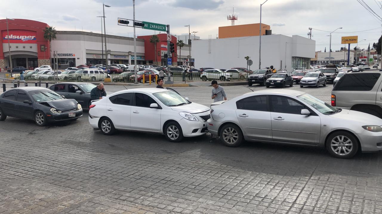 Chihuahua.- Sólo daños materiales dejó un accidente esta tarde de sábado, en el cruce de la avenida Vallarta y Zaragoza, donde el conductor de un vehículo Mazda de color gris frenó repentinamente provocando que en la parte trasera se impactara un vehículo Nissan versa color blanco.