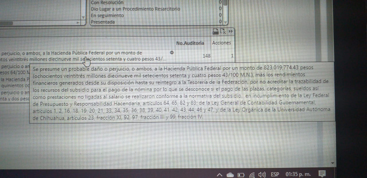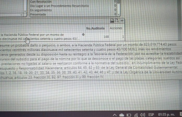 “Se presume un probable daño o perjuicio, o ambos, a la Hacienda Pública Federal por un monto de 823, 019, 774.43 pesos (Ochocientos veintitrés millones diecinueve mil setecientos setenta y cuatro pesos 43/100 M.N.), más los rendimientos generados desde su disposición hasta su reintegro a la Tesorería de la Federación, por no acreditar a trazabilidad de los recursos del subsidio para el pago de la nómina por lo que se desconoce si el pago de plazas, categorías, sueldos así com prestaciones no ligadas al salario se realizaron conforme a la normativa del subsidio, en incumplimiento de la Ley Federal del Presupuesto y Responsabilidad Hacendaria, artículos 64, 65 y 82 y 83; de la Ley General de Contabilidad Gubernamental, artículos 1, 2, 16, 18, 19, 20, 21, 33, 34, 35, 36, 38, 39, 40, 41, 42, 43, 44, 46 y 47, y de la Ley Orgánica de la Universidad Autónoma de Chihuahua, artículos 23, fracción XI, 92, 97, fracción IV”.