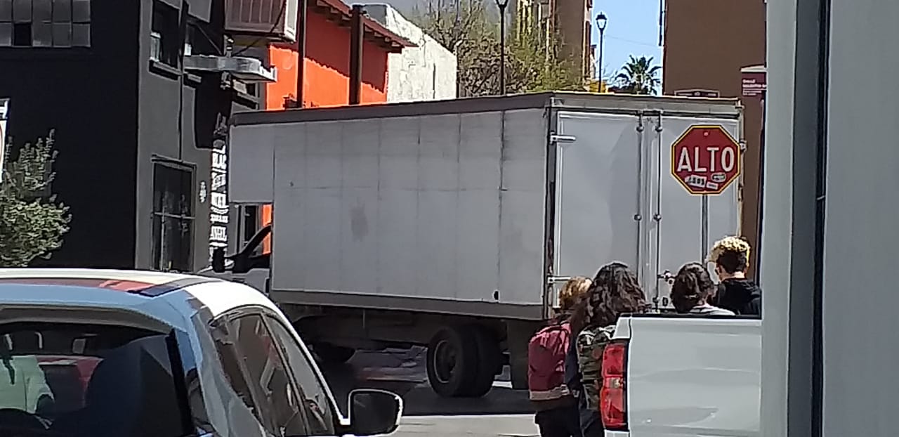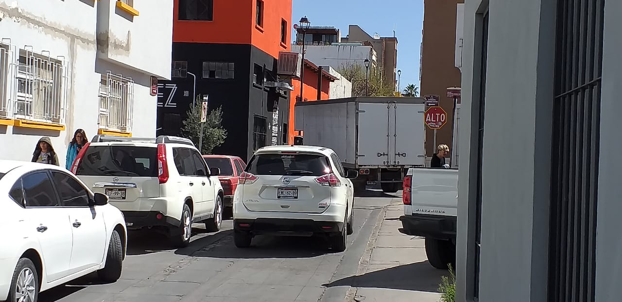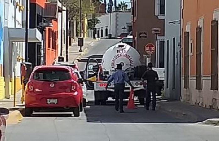 Una vez que se retiró el camión de gas también se captó a una largo camión de mudanzas que tuvo que subir a la banqueta del Café Cortés, de la calle Morelos, para maniobrar la vuelta por la calle segunda, costumbre que daña de manera notable la infraestructura peatonal del centro histórico.