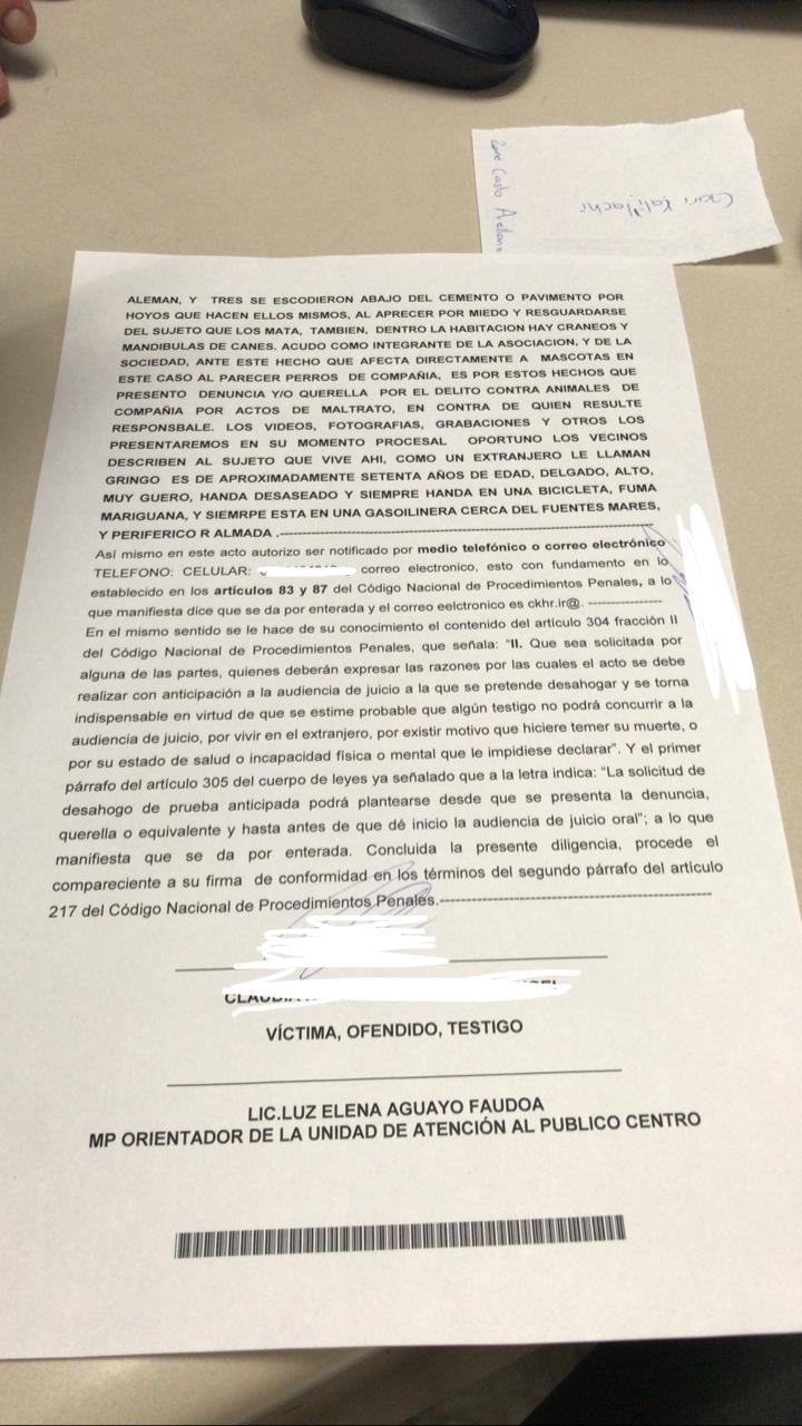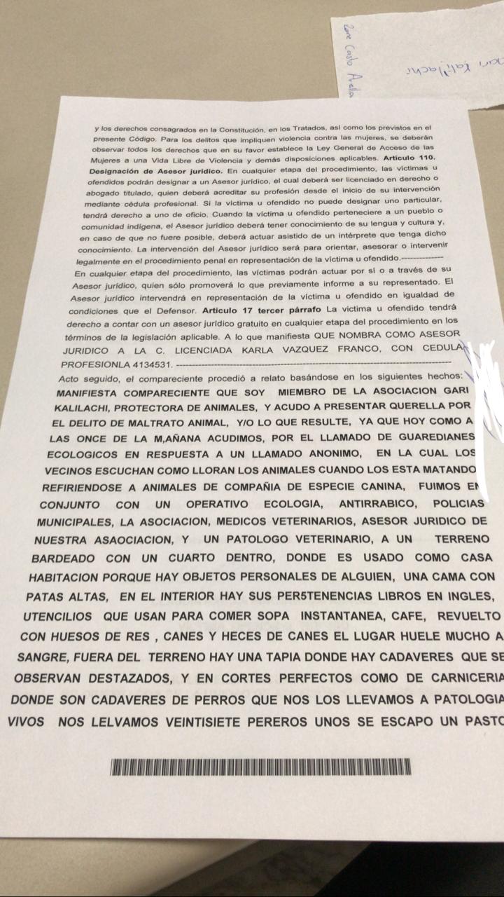 De acuerdo al documento, la denuncia se interpone una vez que la quejosa, representante de la agrupación gari kalilachi, en compañía de personal de desarrollo urbano y ecología, localizaron durante una inspección en un predio, lo que al parecer es un rastro clandestino.