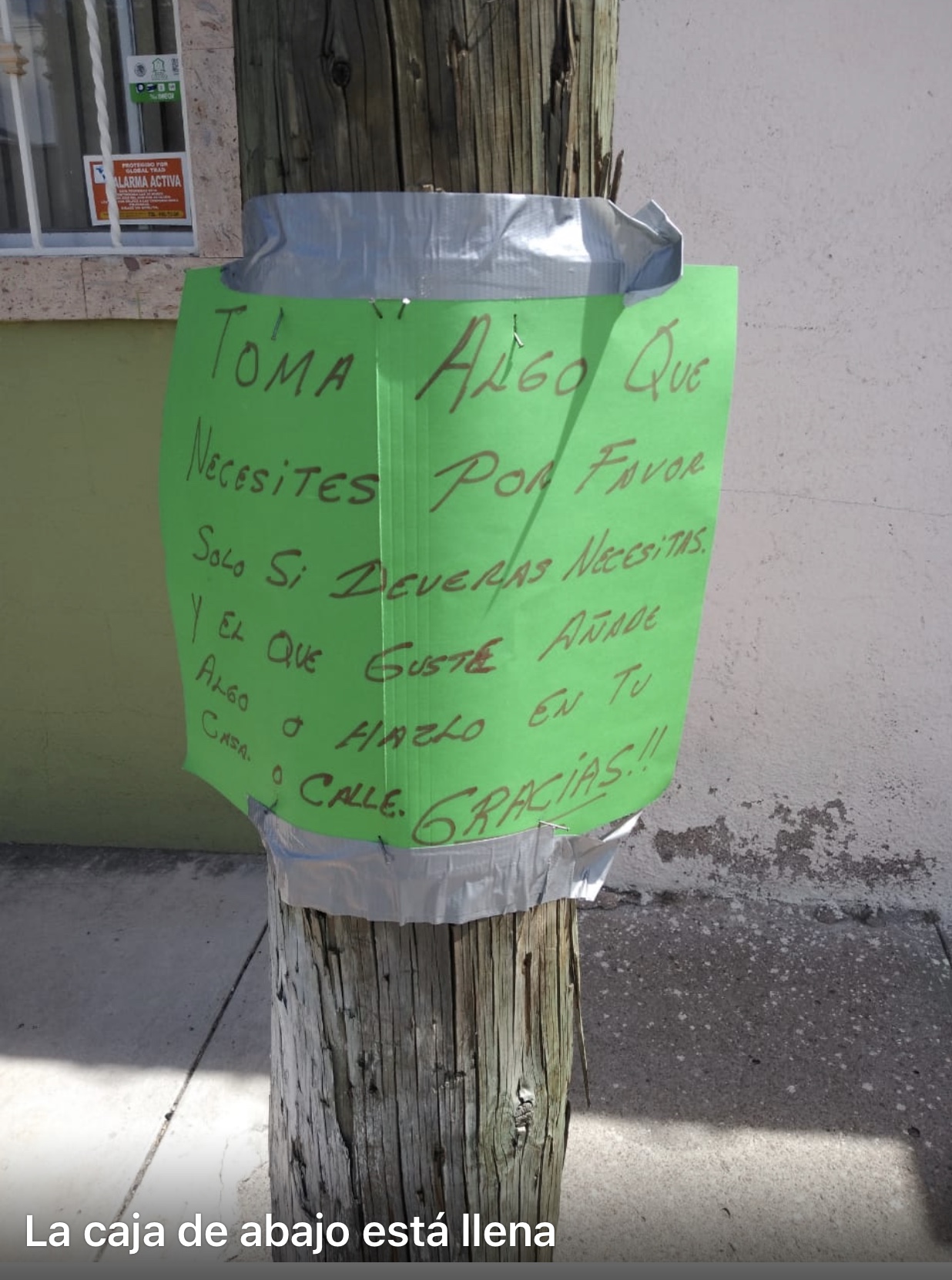 Chihuahua.- Debido a la contingencia por la pandemia del Coronavirus, un vecino de la colonia Roma Sur, puso a disposición de quien necesite víveres para tener comida y pueda llevar la cuarentena en casa y para quien pueda ayudar done alimentos de primera necesidad.