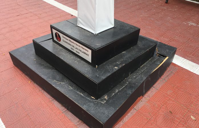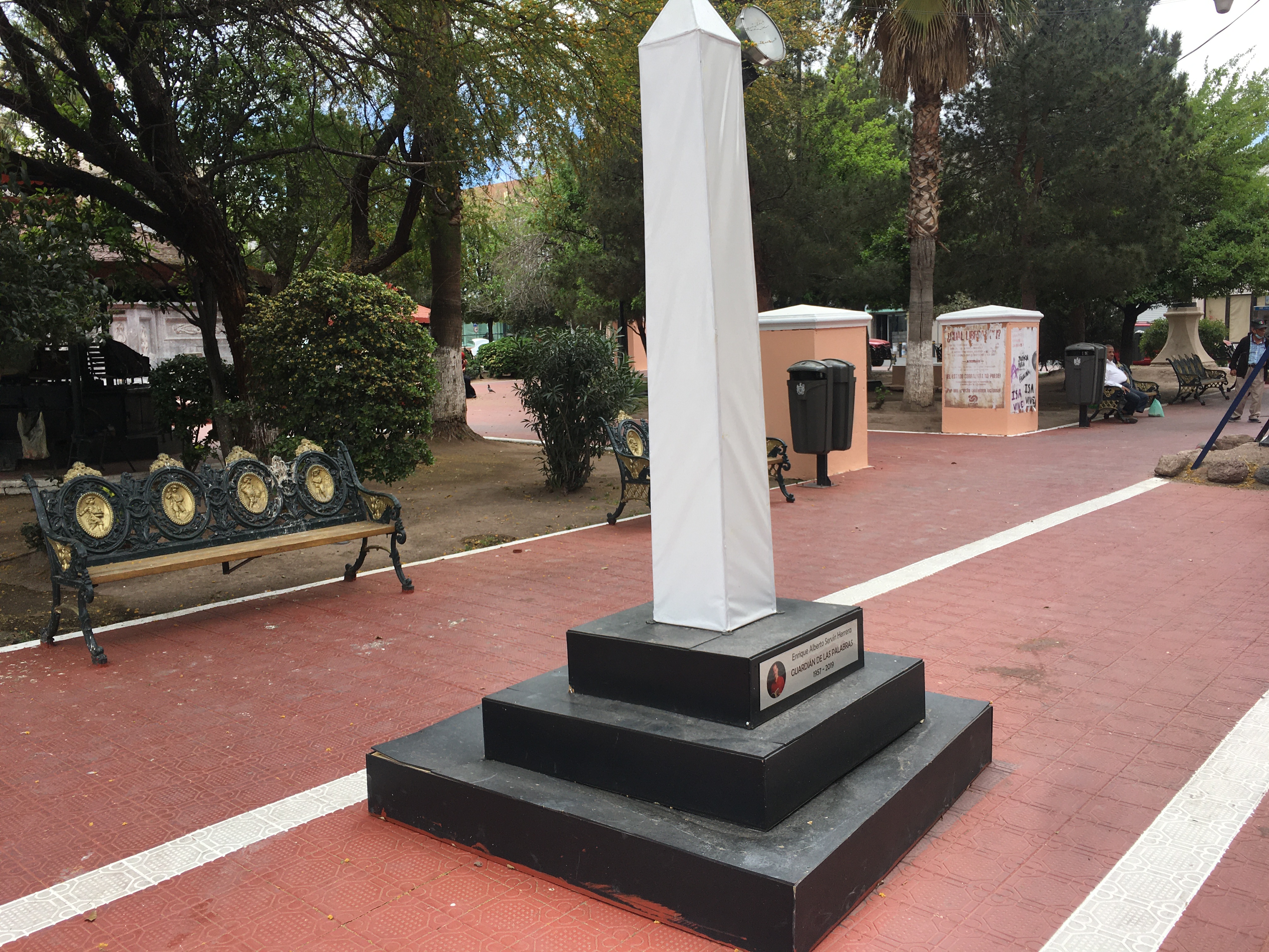 Chihuahua.- Y el obelisco a escala que colocaron activistas en la plaza Hidalgo en memoria del maestro Enrique Servín, se encuentra a punto de caer.