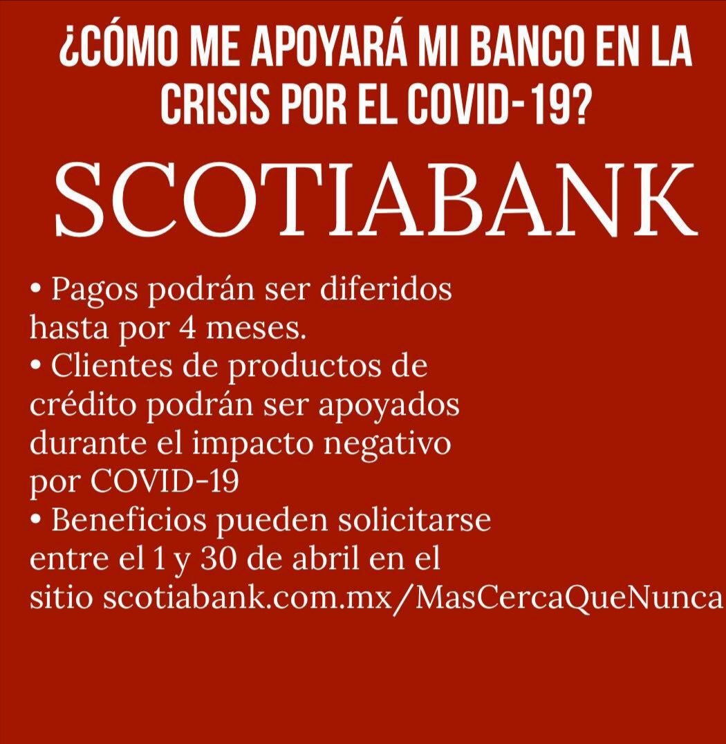 Finalmente scotiabank ofrece pago de créditos diferidos a 4 meses, clientes de producto de crédito podrán ser apoyados durante el impacto negativo por virus, beneficios podrán solicitarse a partir del.1 de abril en scotiabank.com.mx/mascercaquenunca.