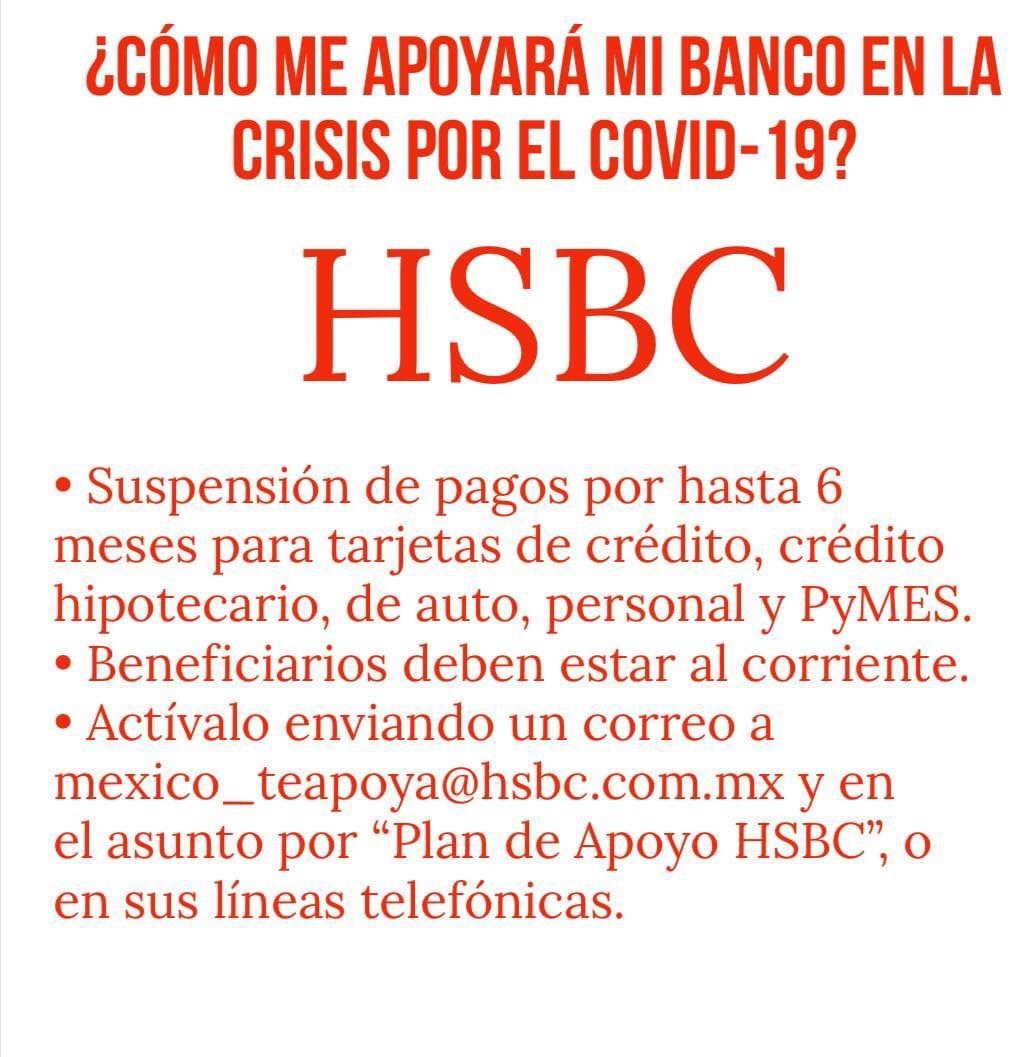 HSBC suspende pagos hasta por 6 meses en créditos similares, cuentahabientes deberán estar al corriente en sus pagos, y se activa vía email a [email protected]