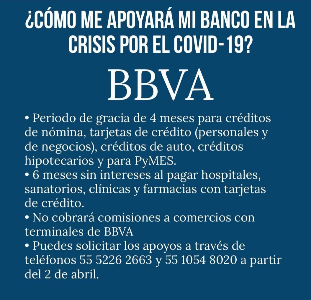 BBVA apoya con cuatro meses de gracia en pago de.los créditos también, nómina,automotriz, personal, tarjeta de crédito, hipotecario, pymes. 6 meses sin intereses en pago a hospitales, sanatorios, clínicas y farmacias, no cobrará comisiones a comercios con terminal BBVA, solicitar apoyos a partir del 2 de abril en teléfonos 5552262663.