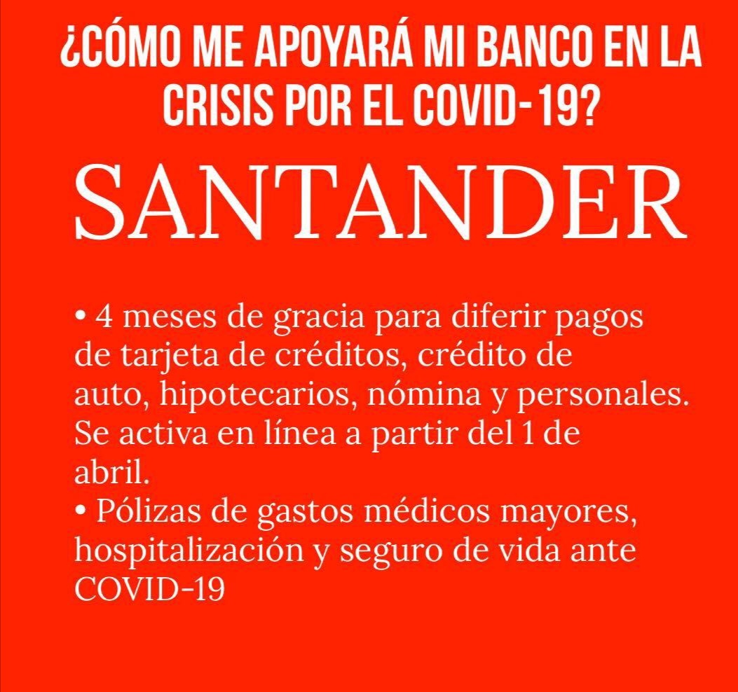 Santander por su parte ofrece cuatro meses de gracia en pagos de créditos similares a los anteriores, se activa en línea a partir del primero de abril, pólizas de gastos mayores, hospitalización y seguro de vida ante covid-19.