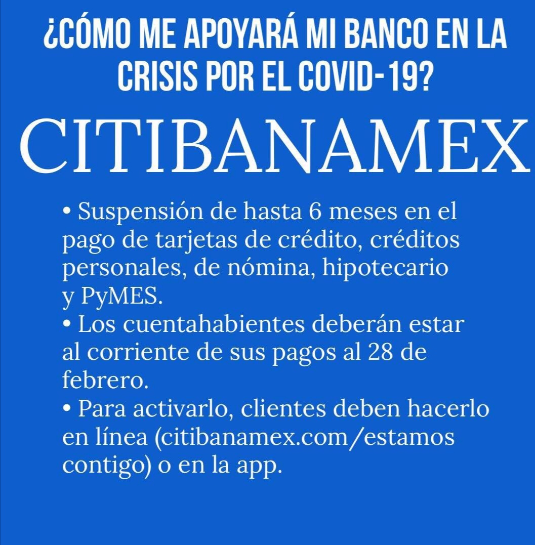 Citibanamex suspende hasta en 6 meses en el pago de créditos, pide que los cuentahabientes estén al corriente de sus pagos al 28 de febrero, para activarlo deben hacerlo en línea Citibamex.com