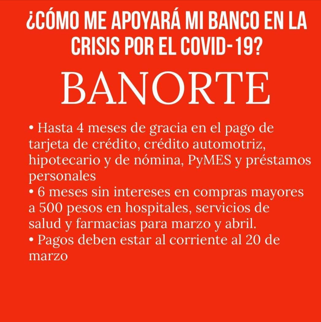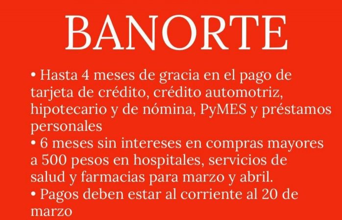 Banorte ofrece hasta cuatro meses de gracia en el pago de tarjetas de crédito, automotriz, hipotecario, nómina, pymes y personales. 6 meses sin intereses en compras mayores a 500 pesos en hospitales, farmacias y servicios de salud.