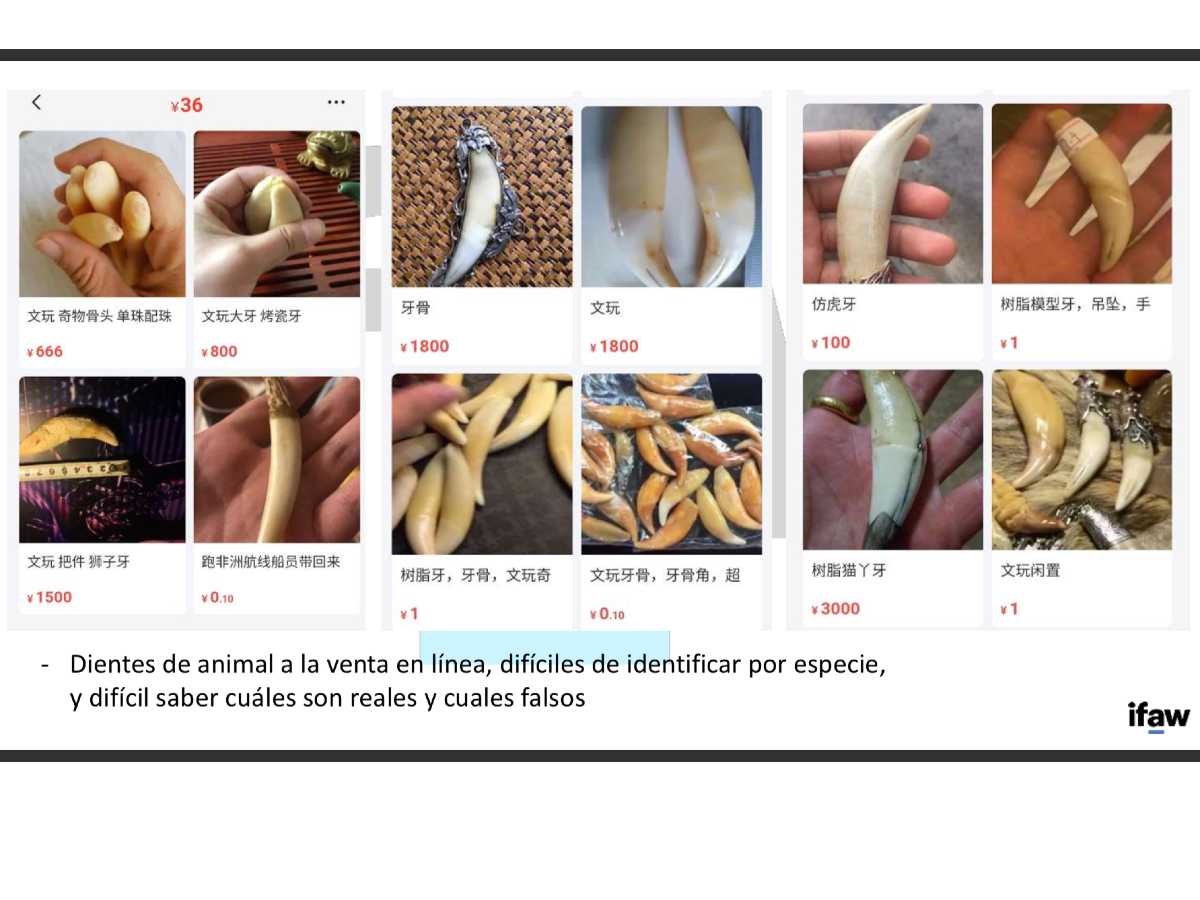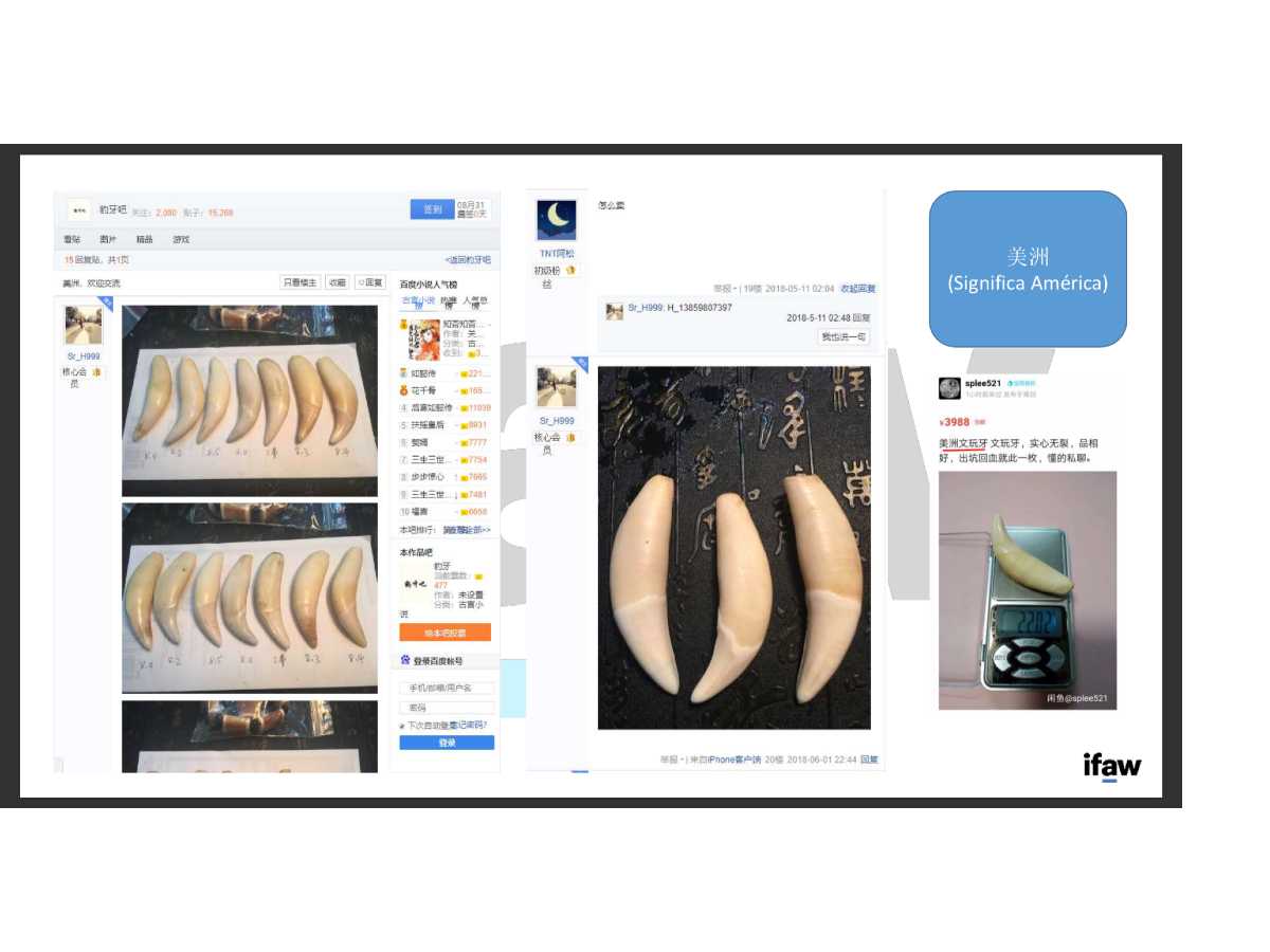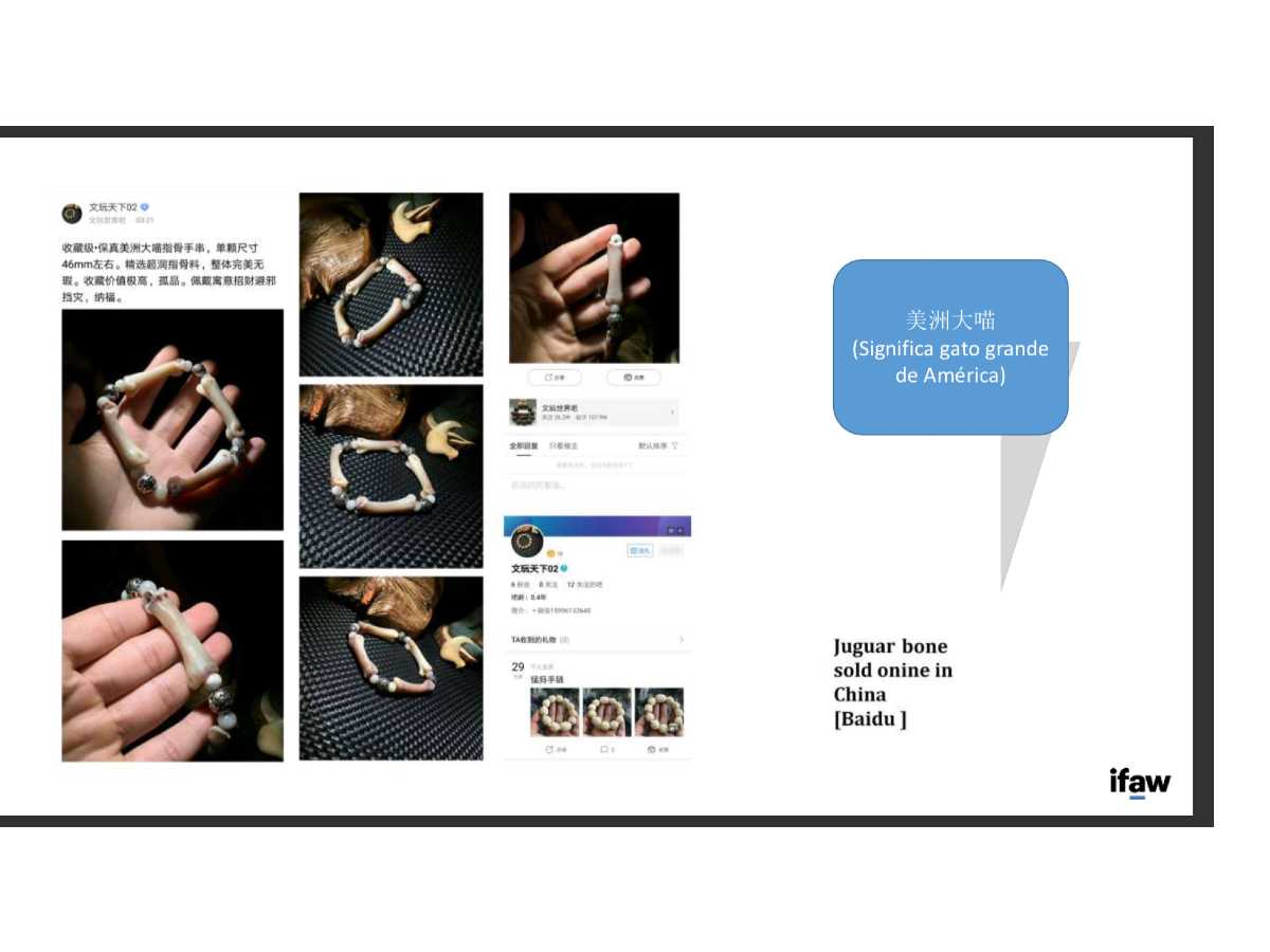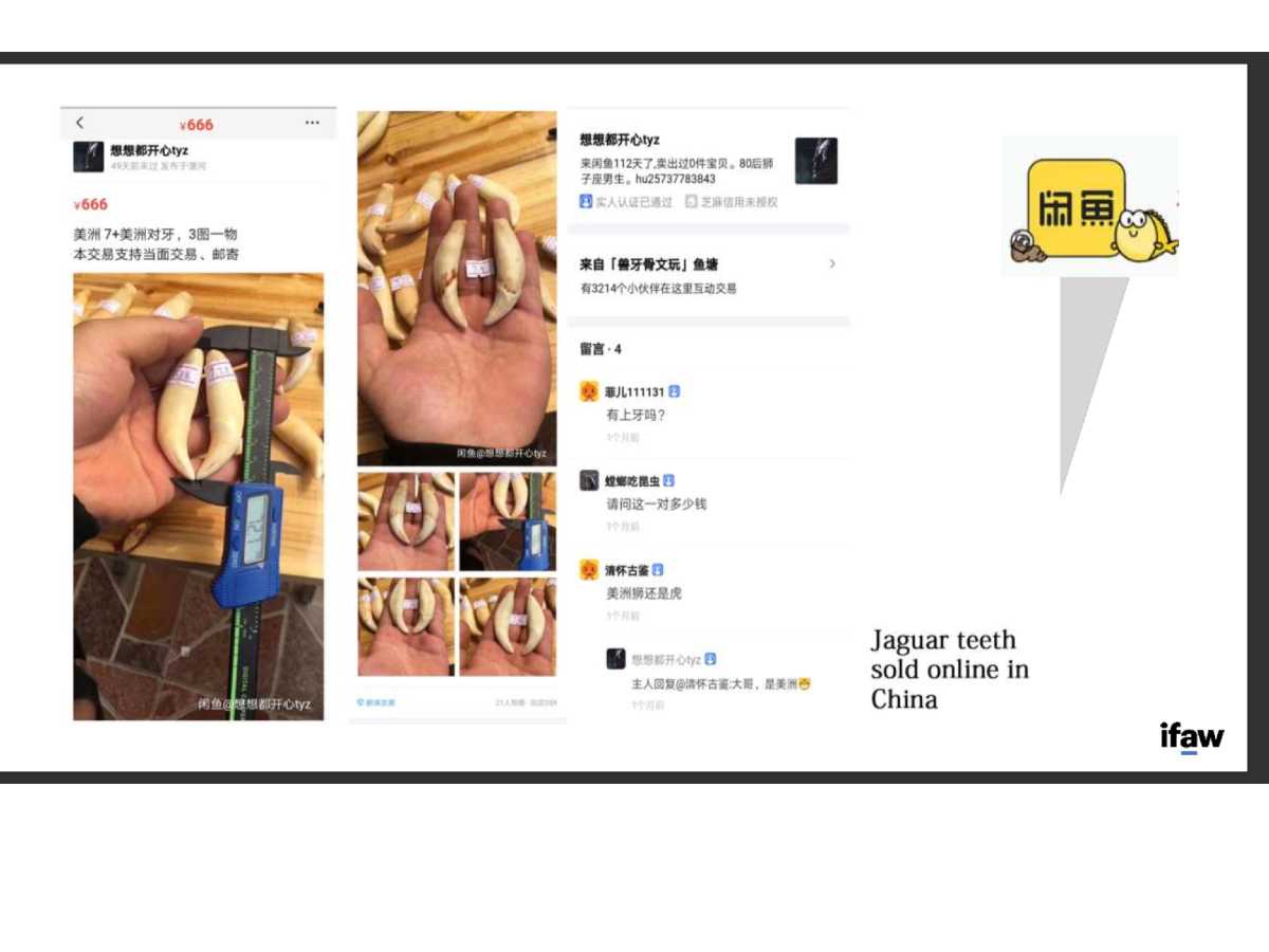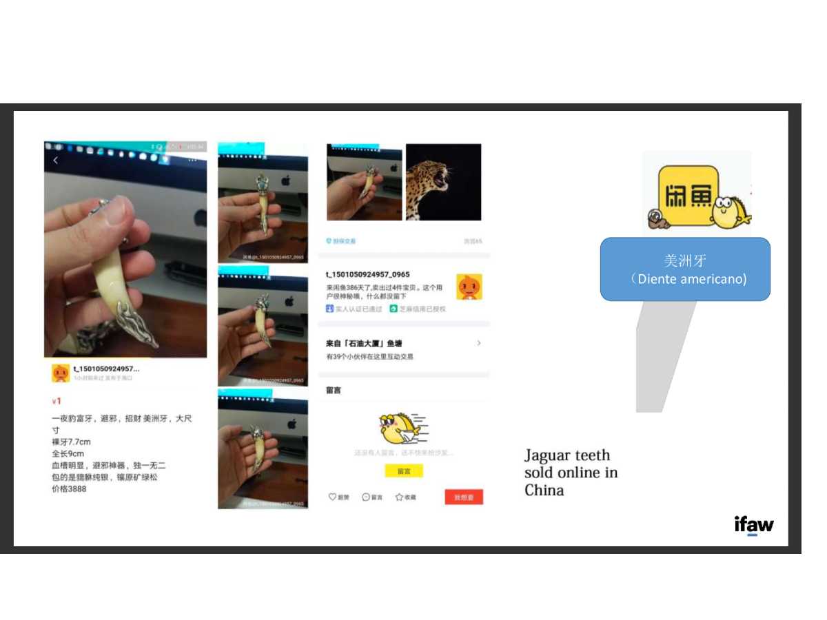 El activista precisó que a través de la investigación realizada con apoyo de la oficina de IFAW en China, entre marzo y mayo de 2019, se pudieron hallar 28 publicaciones de venta de partes de jaguar en Baidu post bar, la comunidad en línea más grande de China y 56 anuncios en la plataforma de segunda mano Xianyu.
