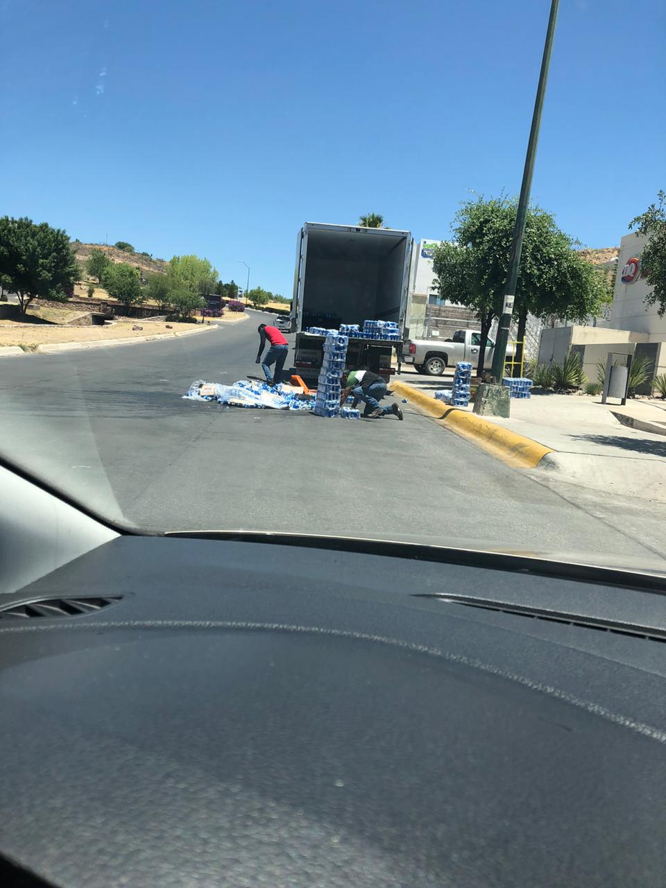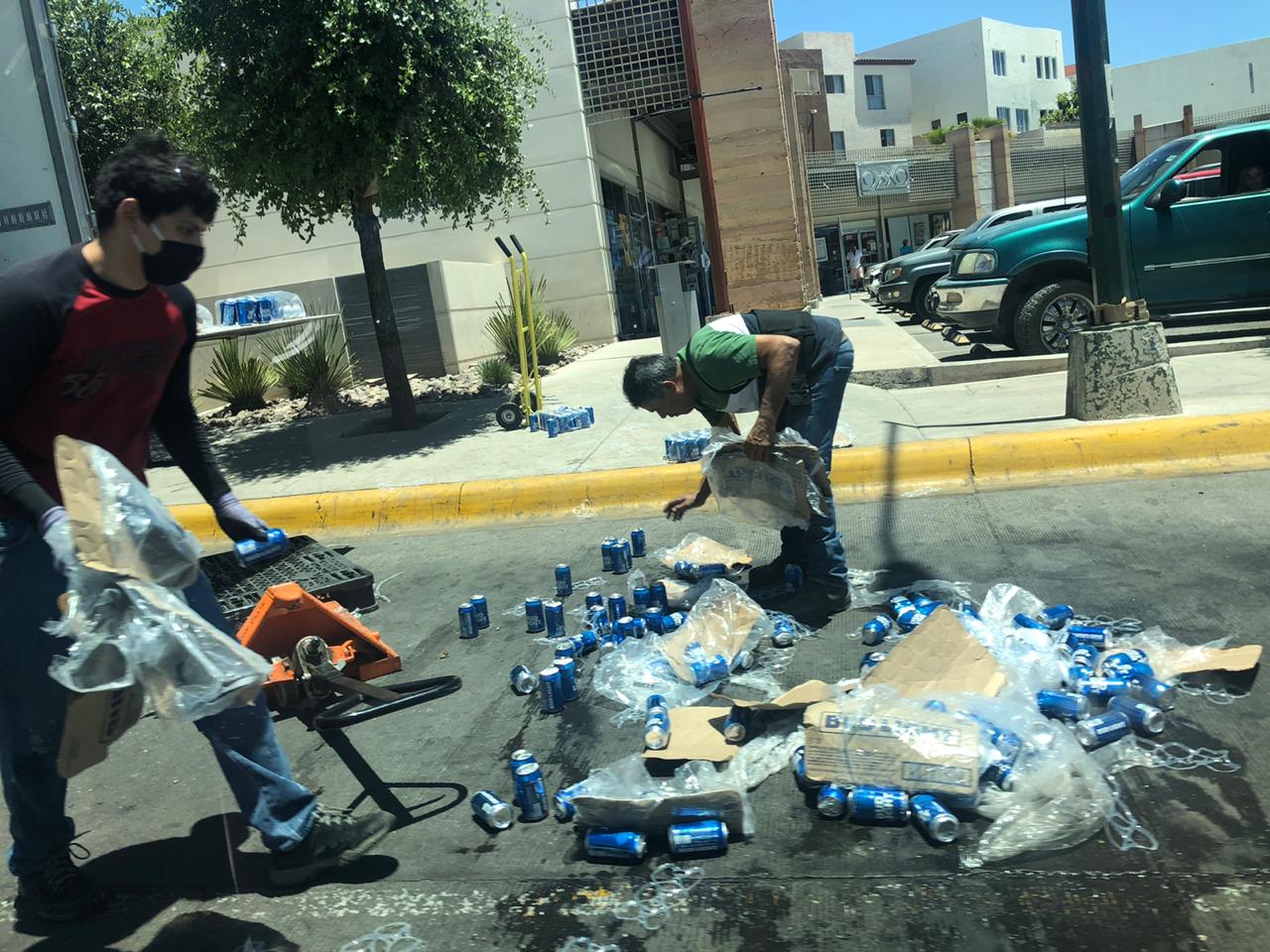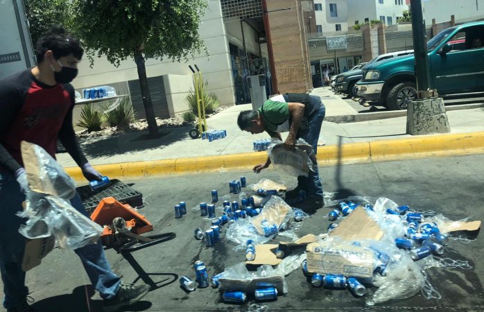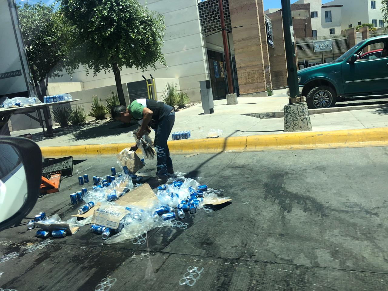 Chihuahua.- Este mediodía se reportó un peculiar incidente en la avenida de la Cantera, en donde empleados de Bud-Light tiraron accidentalente al suelo varias latas de cerveza.