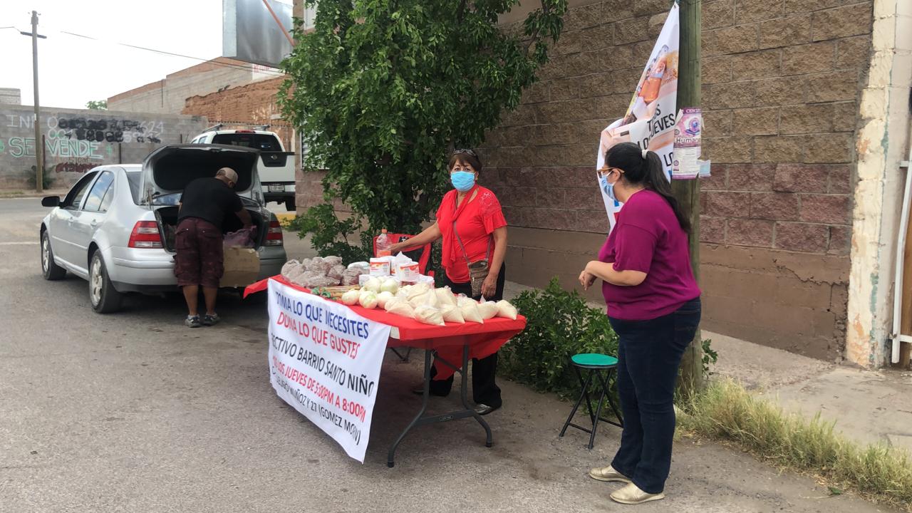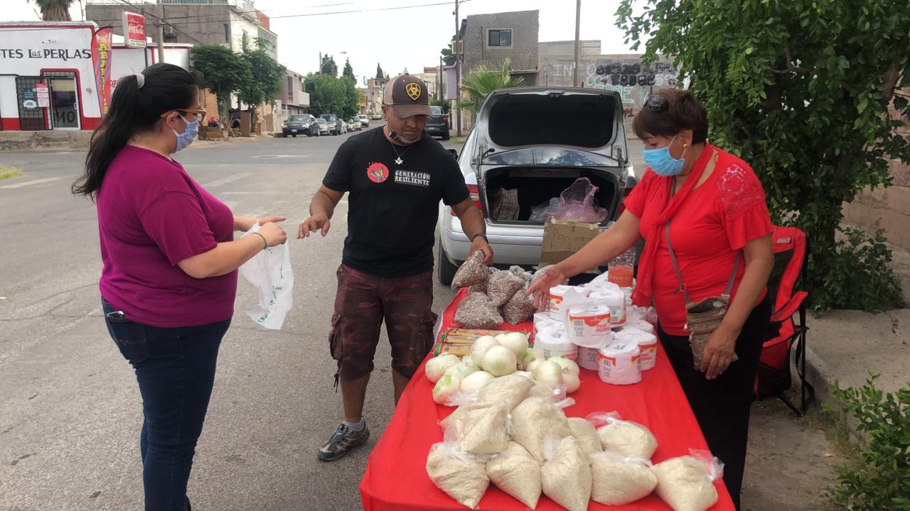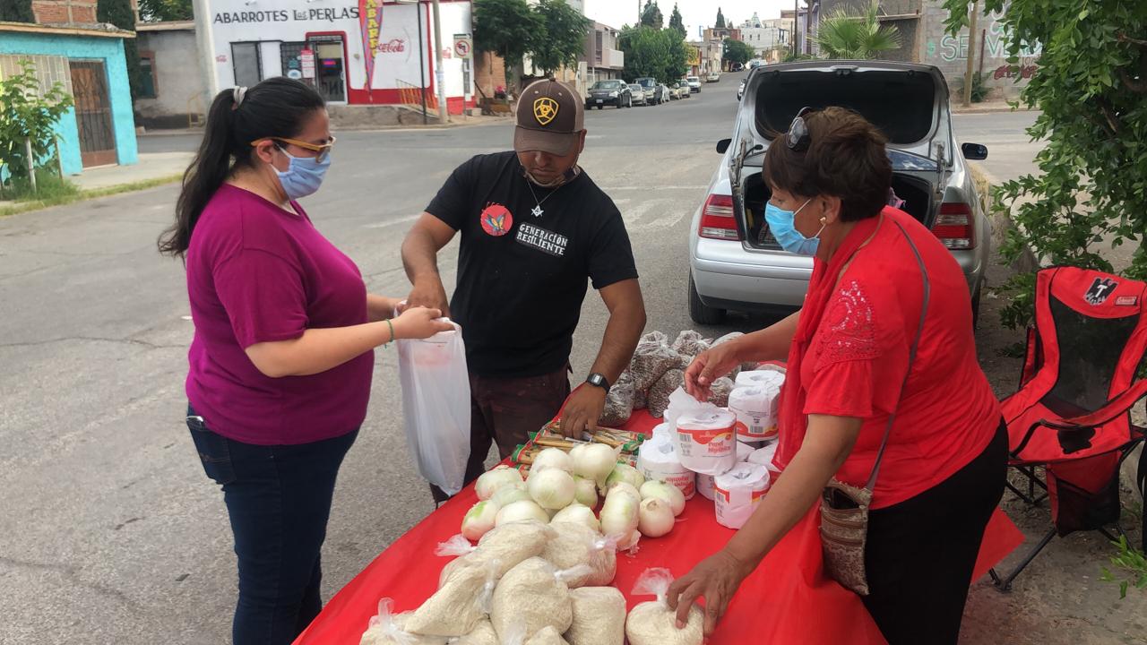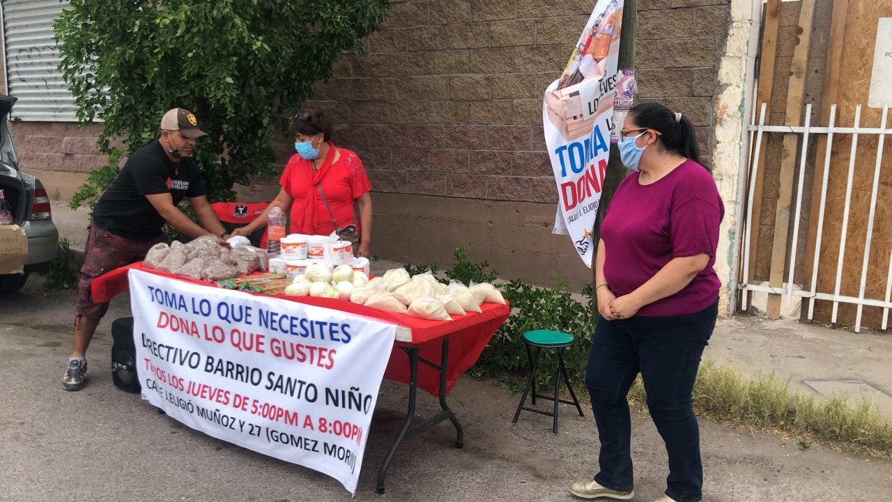 Todos los jueves entre las 17:00 y las 20:00 horas colocan en la esquina de las calles Eligio Muñoz y 27ª o Gómez Morín, un stand en donde los ciudadanos que no cuentan con alimentos por la contingencia sanitaria, puedan tomar algunos productos básicos.