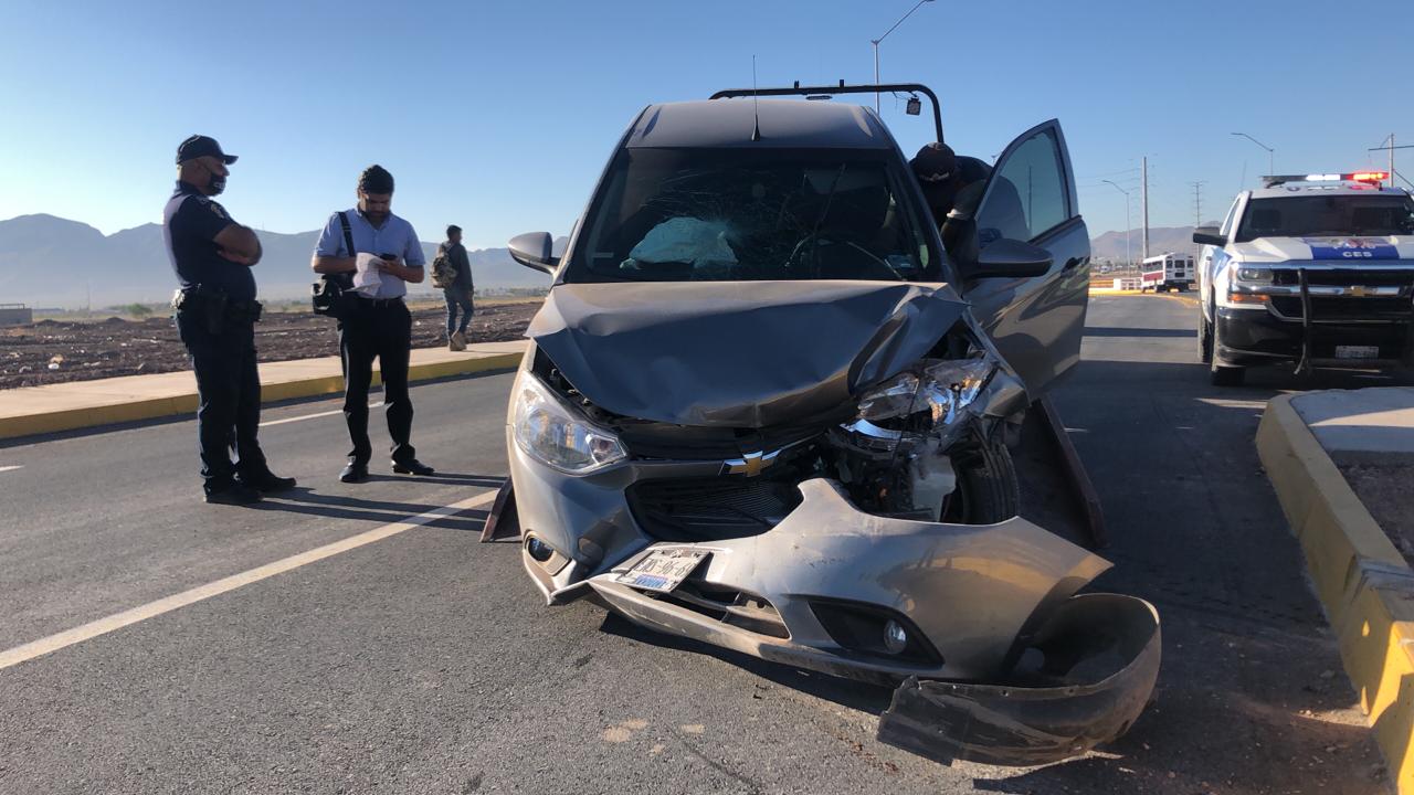 Chihuahua.- Un choque se registró la mañana de este sábado en la avenida Quinta Real y Jardines de Oriente, al sur de la ciudad, dejando por fortuna solo daños materiales.