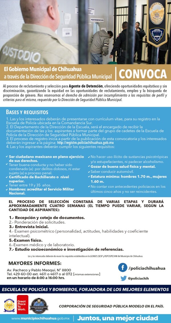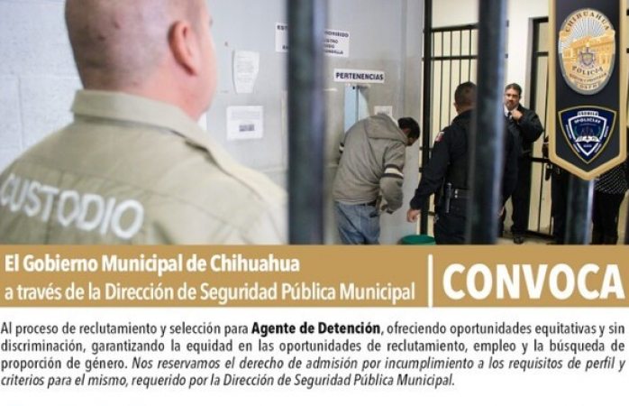 Chihuahua.- A quienes tengan vocación de servicio y quieran pertenecer a una corporación modelo, el Gobierno Municipal, a través de la Dirección de Seguridad Pública Municipal, los invita a registrar sus datos de manera virtual para ser considerados en el proceso de reclutamiento para el puesto de “Custodio de Barandilla”, que se estará llevando a cabo por etapas en la Escuela de Policía.