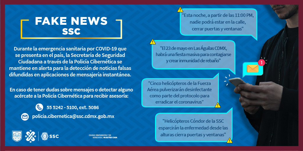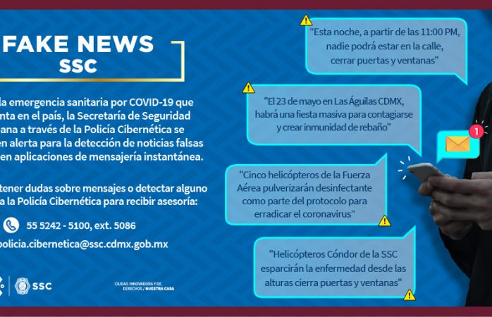 Al respecto, la SSC refiere que “a través de la Policía Cibernética se mantiene en alerta para la detección de noticias falsas difundidas en aplicaciones de mensajería instantánea”.