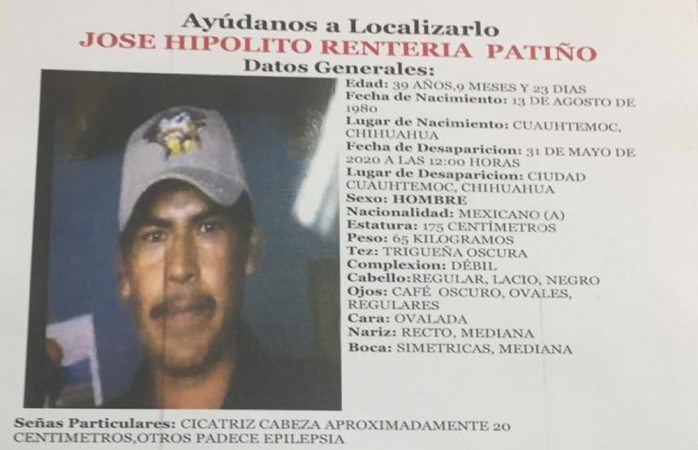 Cuauhtémoc.- Piden la ayuda de la ciudadanía para localizar a José Hipólito Rentería Patiño que desapareció en la ciudad de Cuauhtémoc.