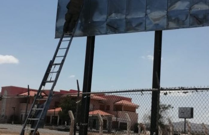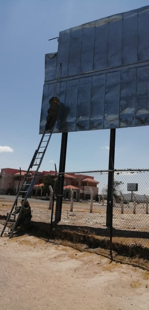 Ahí localizaron un anuncio espectacular de 5 metros de altura, el cual tenía una estructura metálica de 7 por 13 metros y contaba con una lamina de casi dos metros suelta y a punto de caer, lo anterior a causa de los vientos.