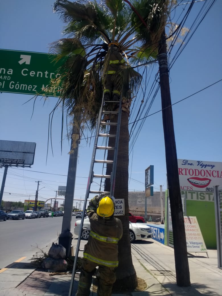 Los bomberos atendieron un corto circuito en la avenida Waterfill y Río Verde, ya que en el exterior de un consultorio dental, las ramas de una palmera de 8 metros provocaban el problema en cables secundarios de Comisión Federal de Electricidad.