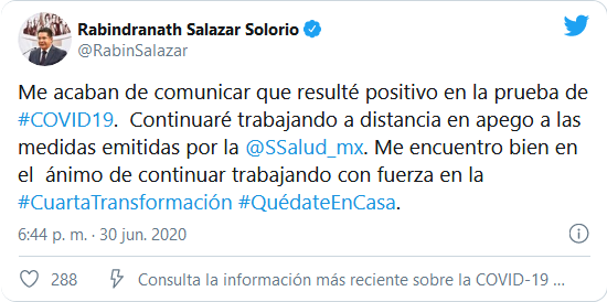 Ciudad de México.- El subsecretario de Gobernación, Rabindranath Salazar, dio a conocer a través de sus redes sociales que dio positivo a Covid-19 la tarde de este martes.