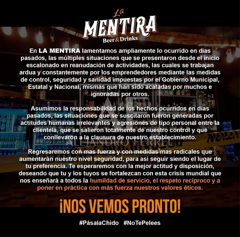 Meoqui.- El bar "La Mentira" emitió su postura tras la colocación de sellos de clausura que ejecutó Gobernación del Estado ante la violación de los lineamientos de los decretos estatales.