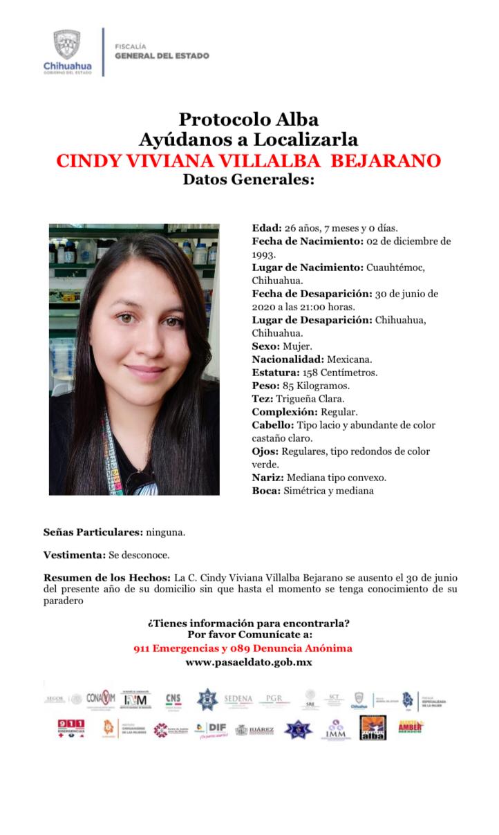 Chihuahua.-La Fiscalía General del Estado giró una pesquisa con relación a la desaparición de la joven cuauhtemense, Cindy Viviana Villalba Bejarano.