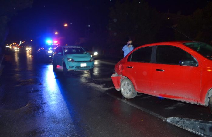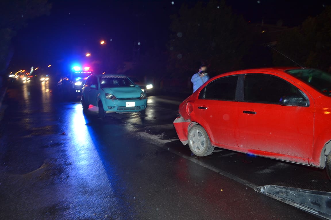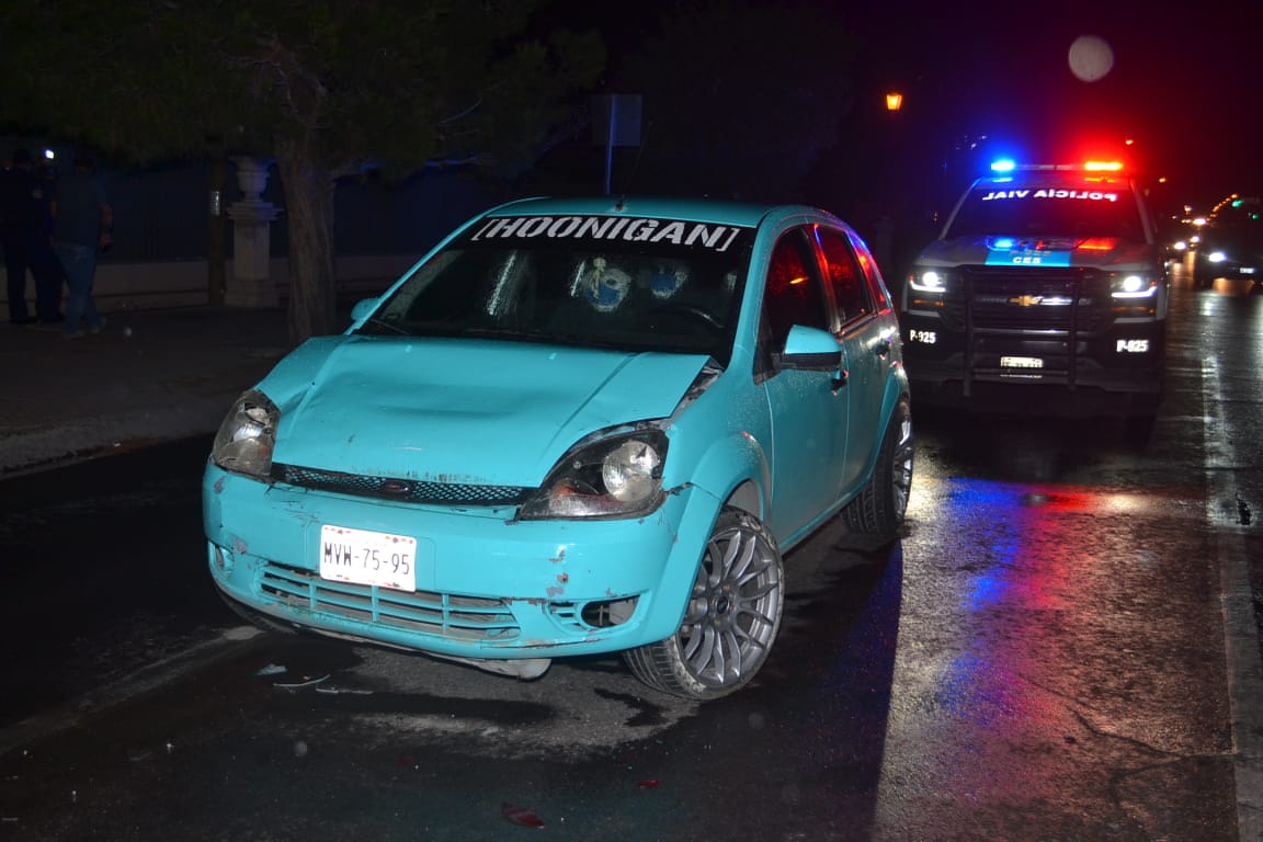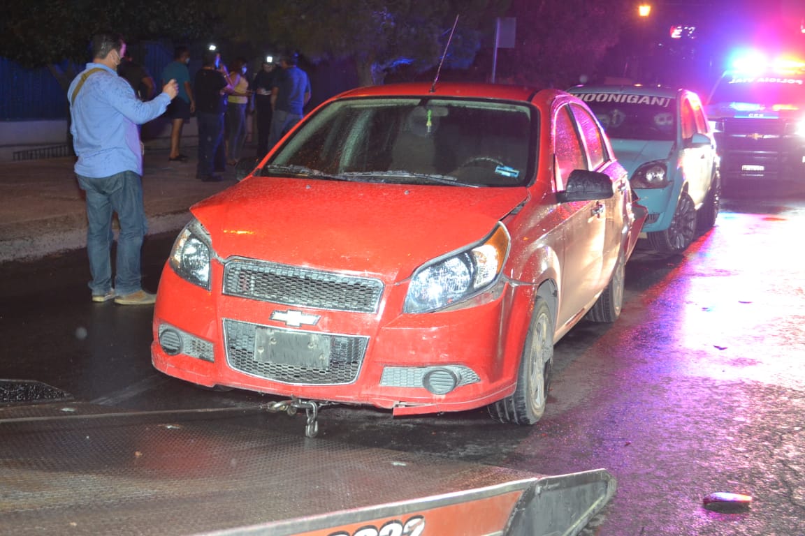 El percance ocurrió en el cruce de las calles Colón y avenida Juárez entre el conductor de un vehículo Ford Fiesta de color azul quien derrapó por el suelo mojado provocando la colisión en contra de los ocupantes de un vehículo Aveo de color rojo en la parte trasera.