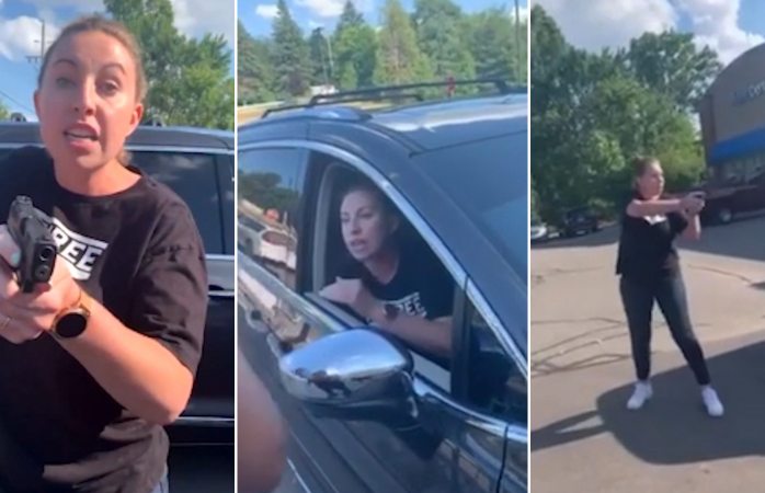 Un video del incidente del miércoles por la tarde en el municipio de Orion, en las afueras de Detroit, que se difundió en redes sociales muestra a la mujer blanca en un estacionamiento apuntando el arma mientras retrocede gritando contra personas que la filmaban y luego se sube a un auto.