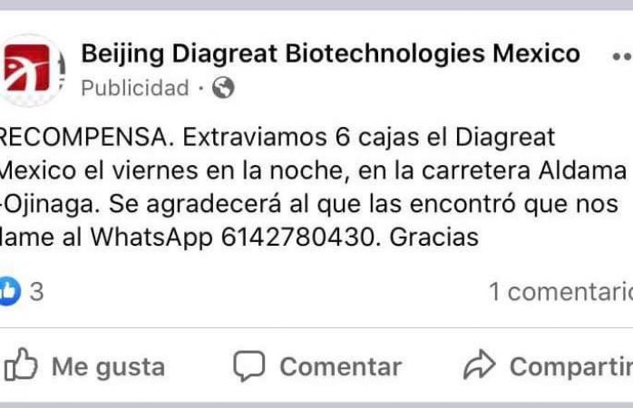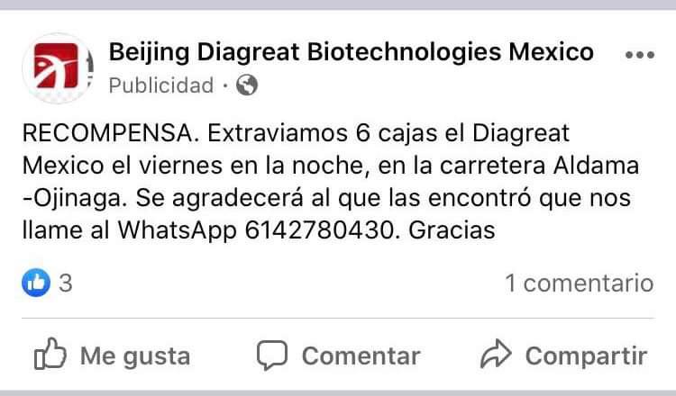 Chihuahua.- Beijing Diagreat Biotechnologies Mexico reportó esta tarde, por medio de anuncios en facebook, el extravío de 6 cajas que contenían pruebas de Covid-19 en la carretera a ciudad Aldama.