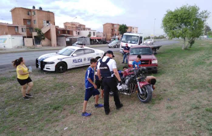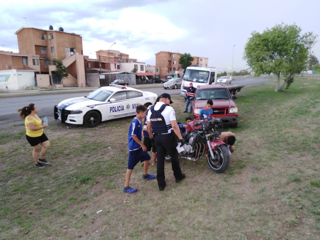 Chihuahua.- Esta tarde se emitió el reporte a los números de emergencia de conductor de sexo masculino de una motocicleta que derrapó al salirse de la cinta asfáltica por vialidad Los Nogales.