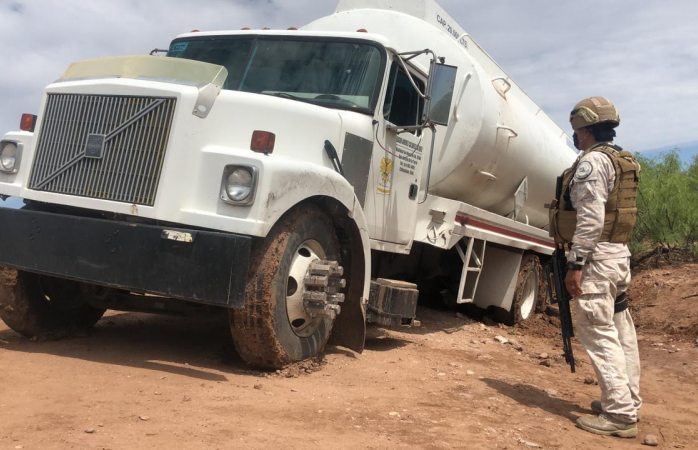 Chihuahua.- Una pipa abandonada repleta de gasolina y toma de “huachicol” fueron localizadas por elementos de la guardia nacional.