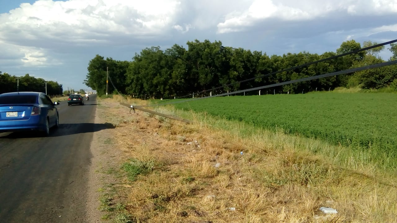 Meoqui.- Un conductor y una menor se llevaron el susto de su vida al salir del camino y chocar contra un poste de madera hasta derribarlo.