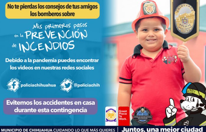 Chihuahua.- Debido al confinamiento y aprovechando el inicio del período vacacional en planteles educativos, en que los niños seguirán en casa, el Heroico Cuerpo de Bomberos del Municipio de Chihuahua, imparte a través de Facebook el programa preventivo “Mis Primeros Pasos en la Prevención de Incendios”, a través de pequeños videos con las recomendaciones básicas de la metodología que comprende 8 pasos.