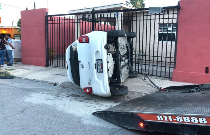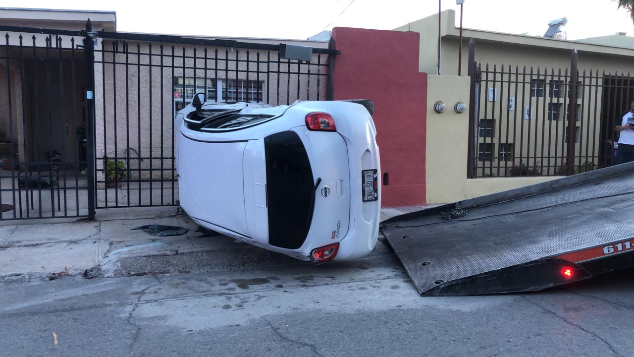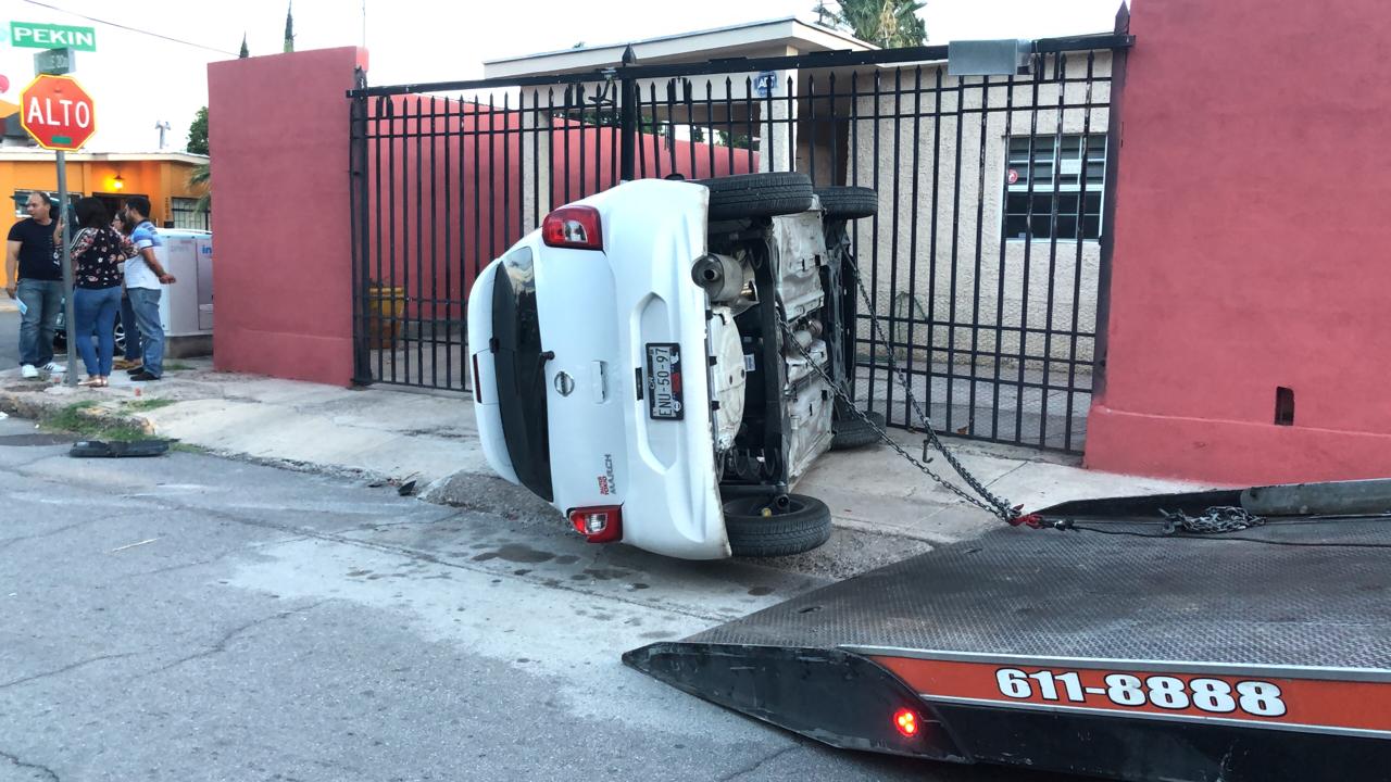 Chihuahua.- Un auto compacto terminó volcado sobre uno de sus costados luego de que el guiador de la unidad se pasara el alto y golpeara contra otro vehículo en la colonia Mirador.