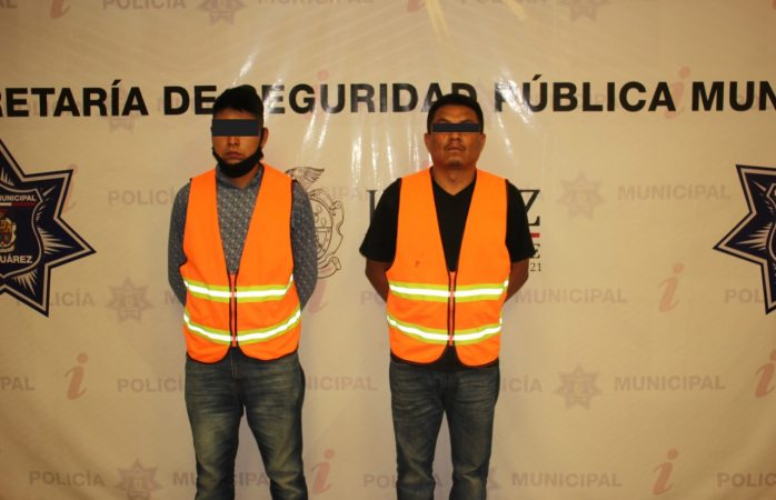 Juárez.- Agentes de la Secretaría de Seguridad Pública Municipal realizaron el arresto de Silvino V. H. y Adrián M. J., por su presunta responsabilidad en la comisión del delito de promoción de conductas ilícitas.