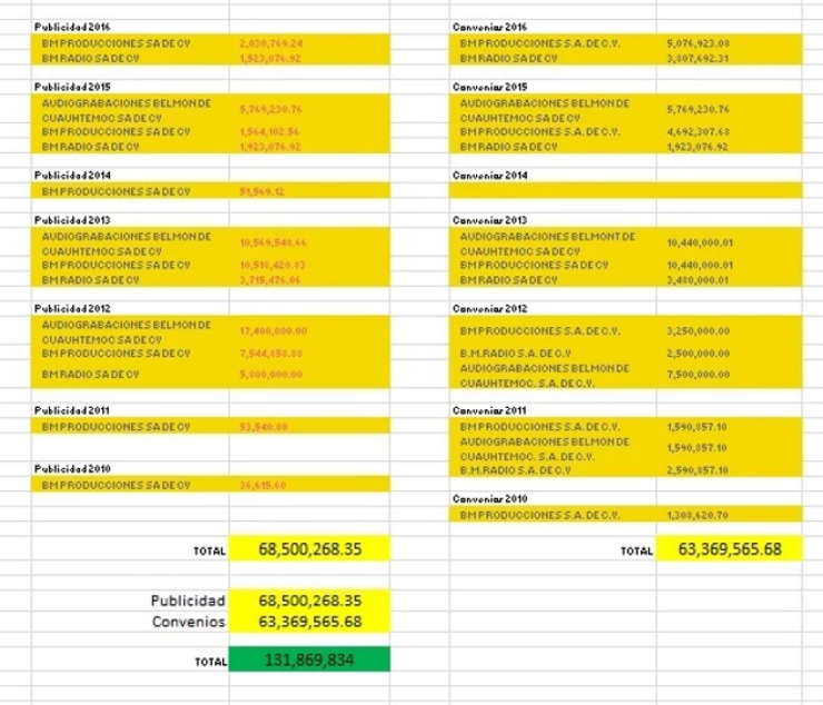 En total, de 2010 a 2016, suman 68 millones 500 mil 268.35 pesos por concepto de -pago de publicidad-, y en el mismo periodo, pero por concepto de -pago de convenios-, se erogaron 63 millones 369 mil 565.68 pesos.