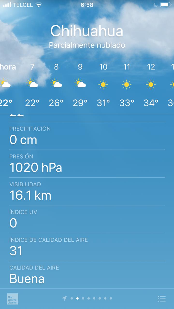 La humedad marcó un 40 por ciento, la velocidad del viento es de 11 kilómetros por hora, provenientes del sur, la visibilidad es de 16.1 kilómetros y la calidad del aire es buena al tocar los 31 puntos.