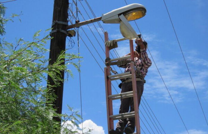 Chihuahua.- Con la finalidad de mantener funcionando el sistema de alumbrado público de la zona rural, el Gobierno Municipal ha dado mantenimiento a 320 lámparas y reflectores, además se han hecho cambios en fotoceldas, balastras y cableado de los meses de enero a junio de 2020 a través de las Direcciones de Desarrollo Rural y Mantenimiento Urbano.