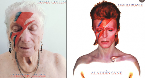 Las portadas replicadas por los abuelitos incluyen "Born In The USA" de Bruce Springsteen, "Bad" de Michael Jackson, "True Blue" de Madonna y el icónico "Aladdin Sane" de Bowie.