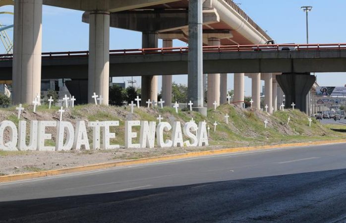 La instalación está acompañada por gigantescas letras con la frase “QUÉDATE EN CASA”, usada por autoridades de Salud en todo el país para destacar la importancia del distanciamiento social en la reducción de contagios de Covid-19.