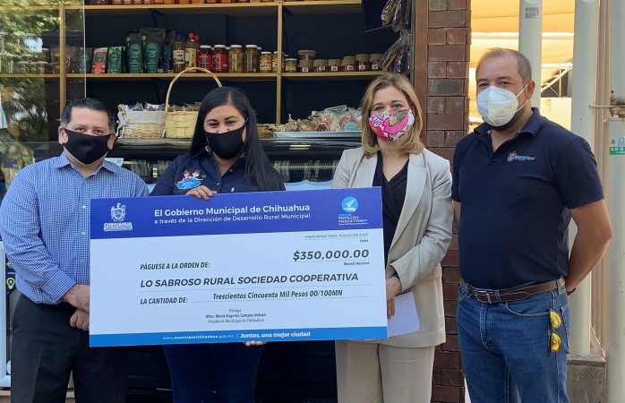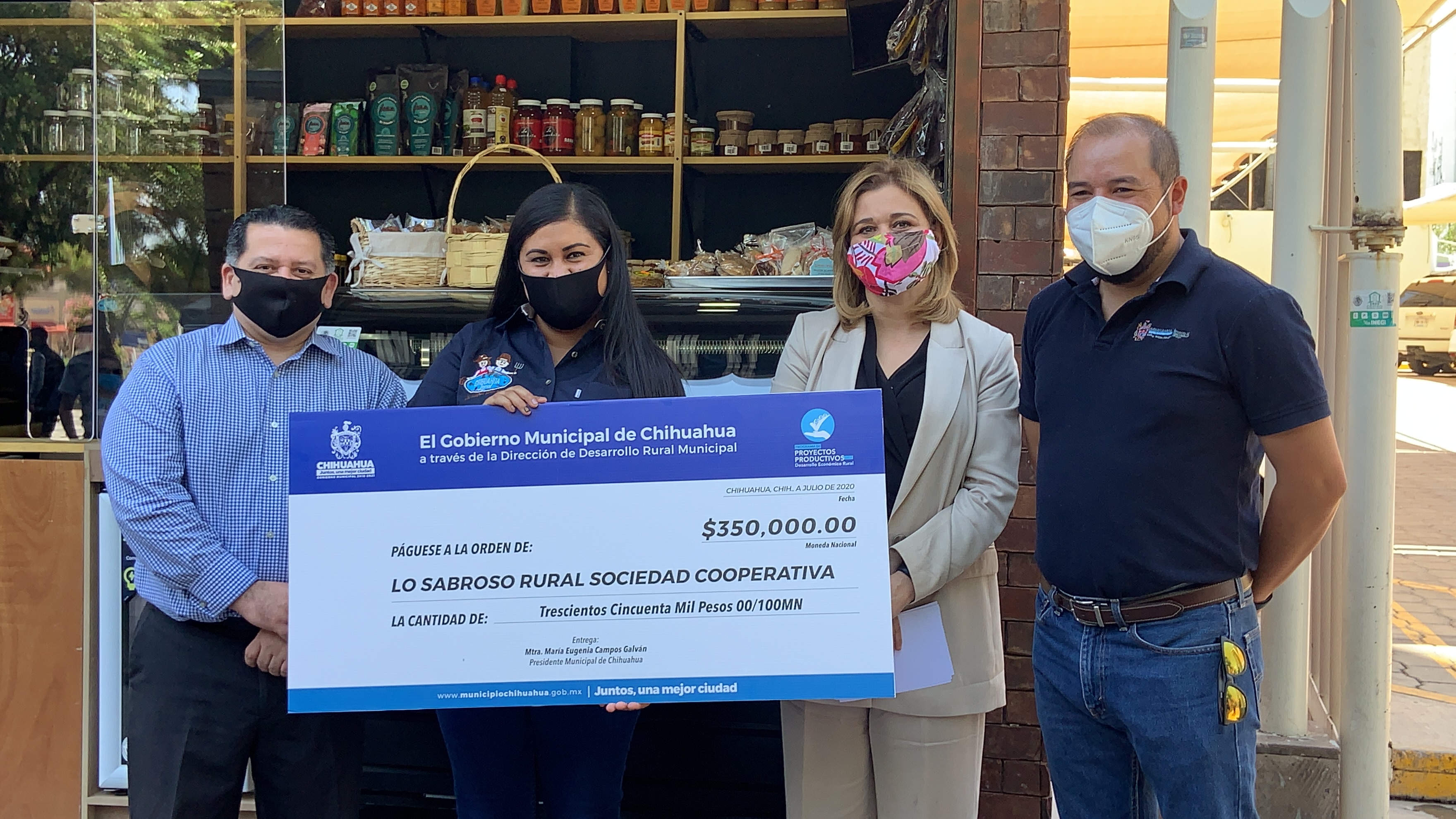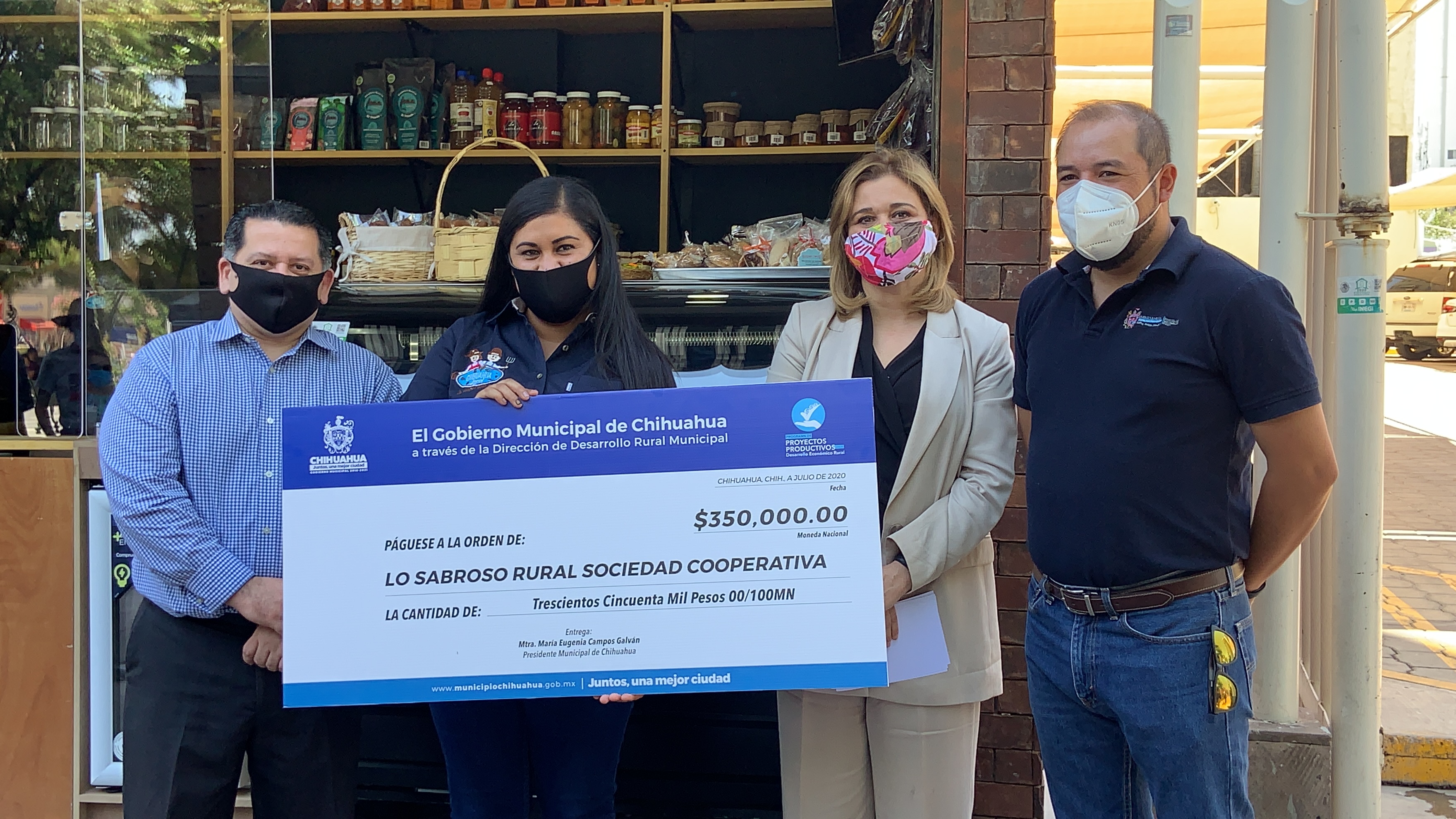 Chihuahua-. La alcaldesa María Eugenia Campos Galván hace entrega de un apoyo económico de 35 mil pesos a local sabroso rural, ubicado en la calle victoria en el centro de la ciudad.