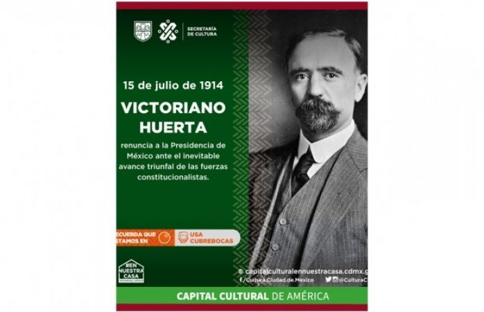 Cdmx.- La secretaría de cultura de la ciudad de México recordó en su cuenta de twitter la caía de Victoriano Huerta en 1914 por las fuerzas constitucionalistas.