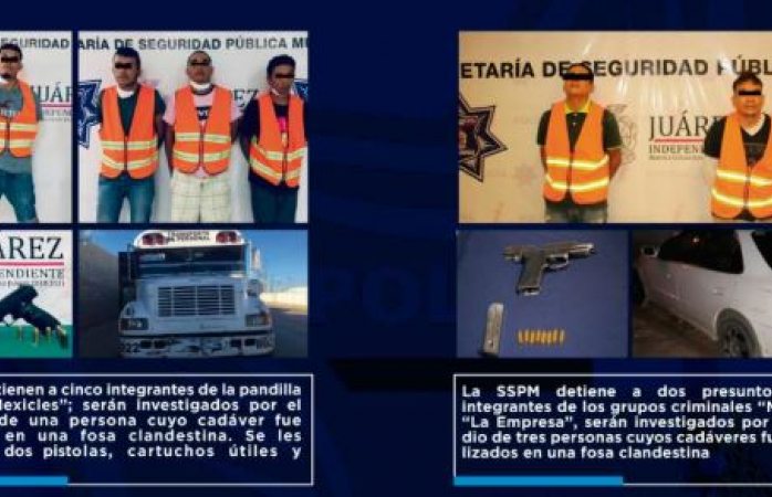 Ciudad Juárez.- La Secretaría de Seguridad Pública Municipal informa que mediante labores de investigación e inteligencia durante la presente semana realizó la detención de 13 presuntos sicarios pertenecientes a diferentes células delictivas esclareciendo siete homicidios, además aseguró siete armas de fuego y varios cartuchos útiles de diferentes calibres, siendo las siguientes: