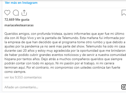 Esta mañana fui informada por la empresa de que han decidido que el programa tome otro rumbo y que debido a ajustes por la pandemia ya no seré mas parte del show… estoy muy agradecida por la oportunidad que me brindaron de haber podido cubrir grandes eventos noticiosos y de servir a nuestra comunidad hispana por tantos años… Ni mi pasión por el trabajo, ni mi carrera terminan aqu