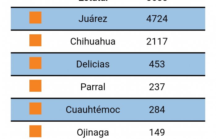En Juárez han perdido la vida 682, Chihuahua 149, Delicias 32, dos más que el día de ayer, Cuauhtémoc 20, Meoqui 16, uno más que ayer, Nuevo Casas Grandes 14 y Parral 8.