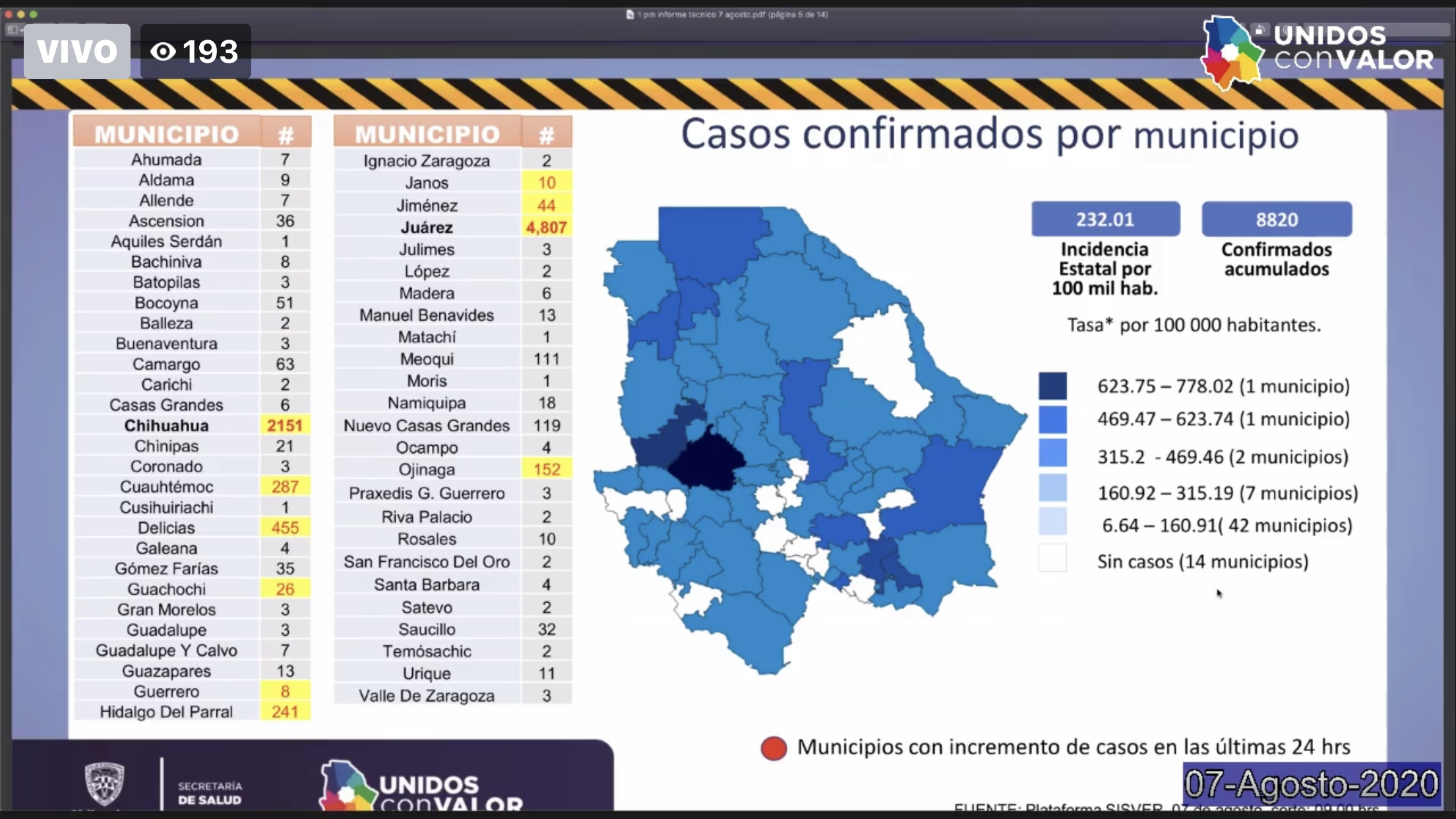 Chihuahua.- Con dos horas de retraso, la secretaría de salud presentó la actualización de casos confirmados de covid 19 en el estado, en donde se confirmaron 89 nuevos contagios.