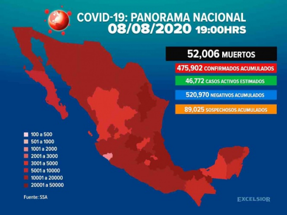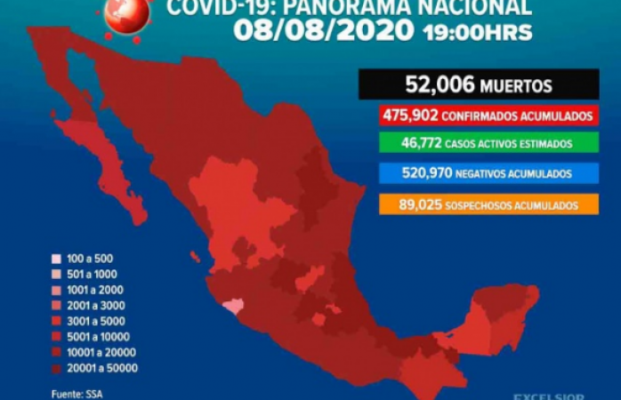 Ciudad de México.- Cifras oficiales revelaron que ascendió a 52 mil 006 el número de muertos por la pandemia de Covid-19 en México, hasta este sábado 8 de agosto, mientras que el número de contagios por este patógeno se incrementó a 475 mil 902 casos.