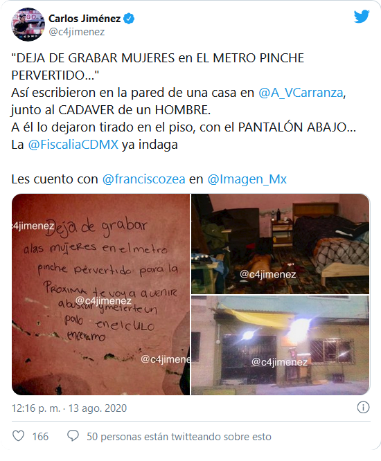 En la agrietada pared del domicilio alguien escribió con tinta negra: “Deja de grabar a las mujeres en el metro p… pervertido. Para la próxima te voy a venir a buscar y voy a meterte un palo en el … enfermo”.
